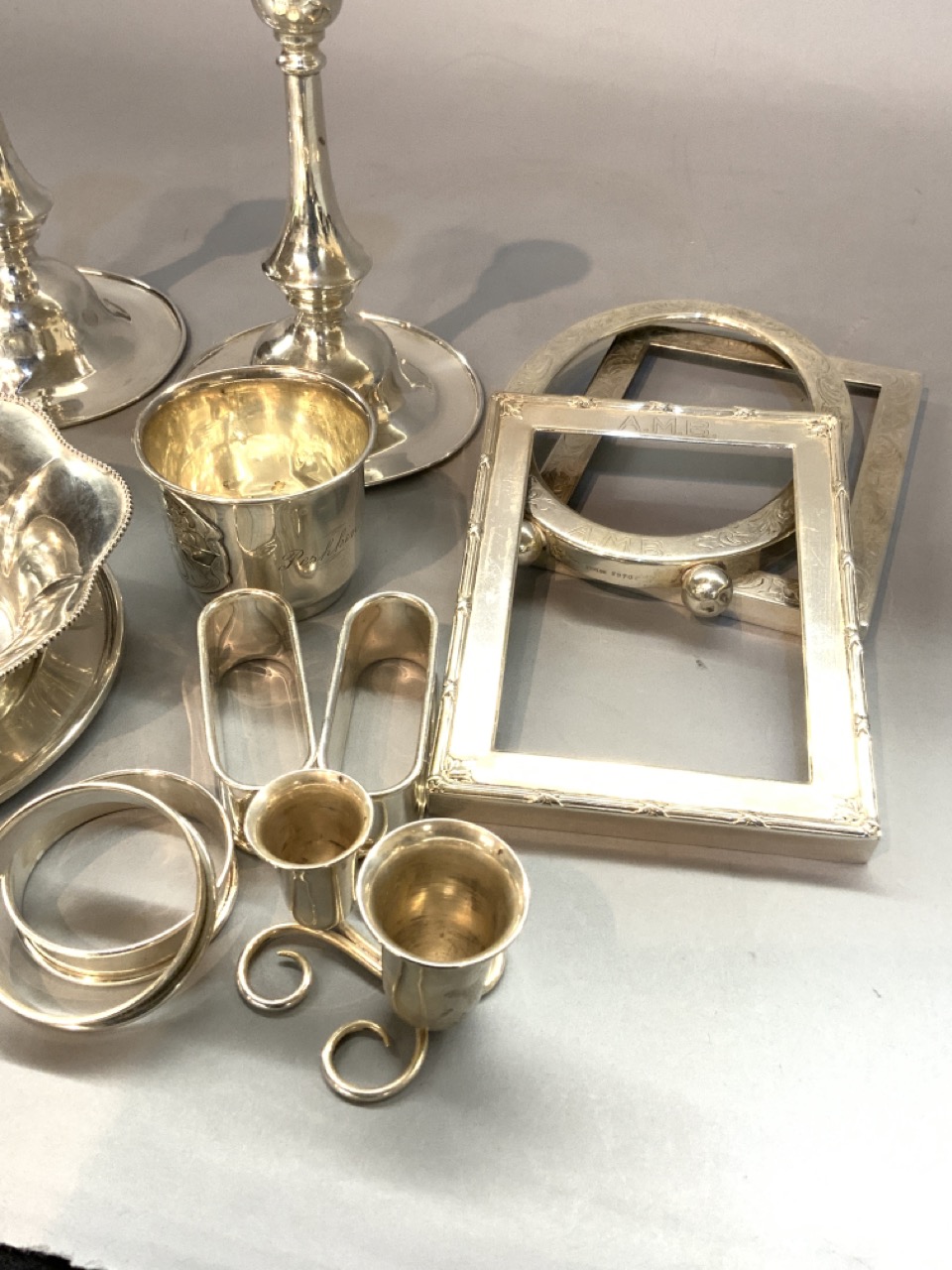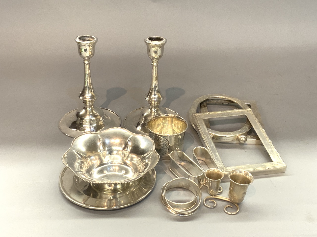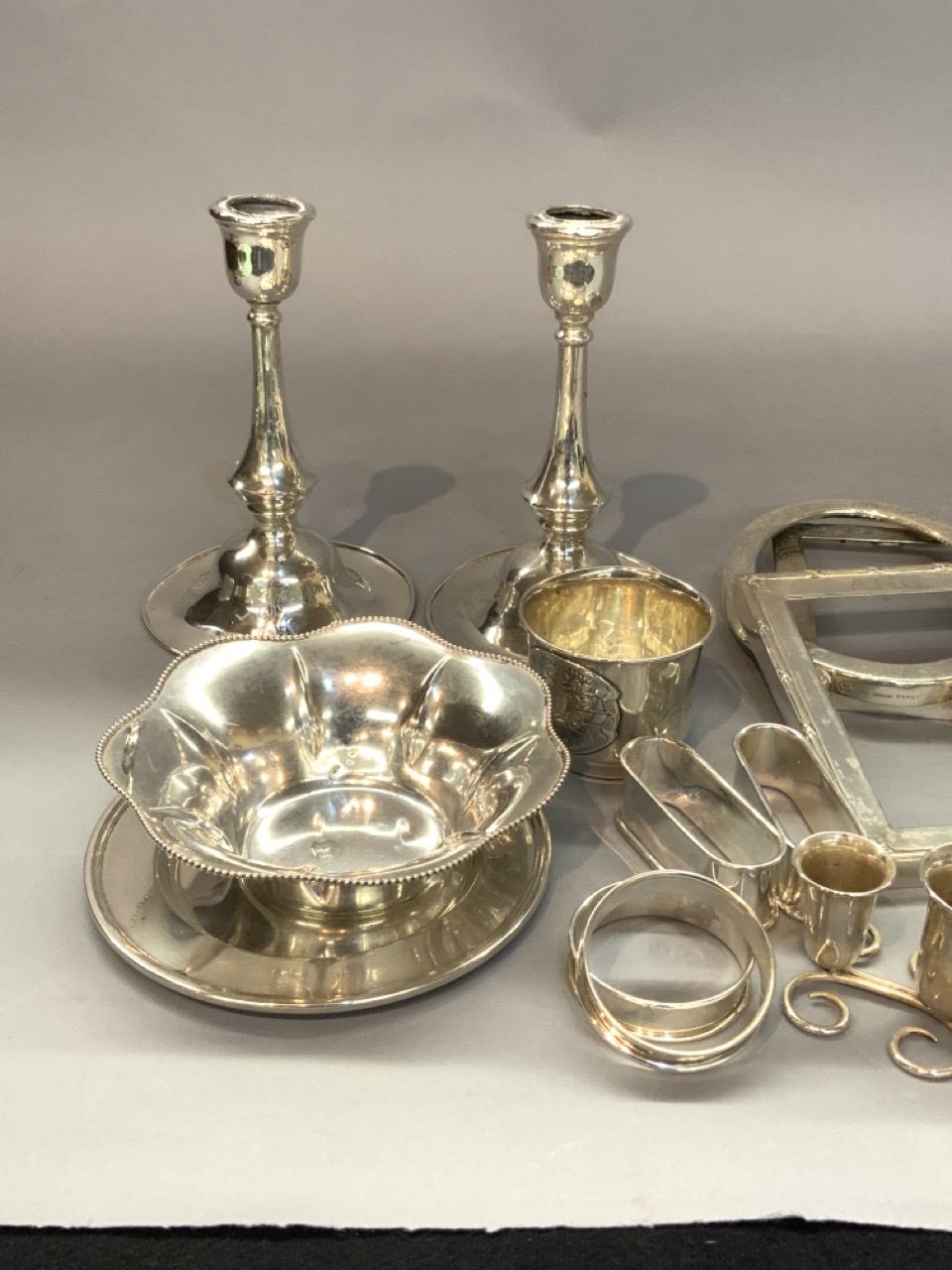 A compiled grouping of sterling silver tablewares including candlesticks, cup, napkin rings and frames.