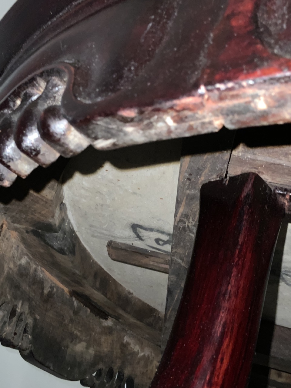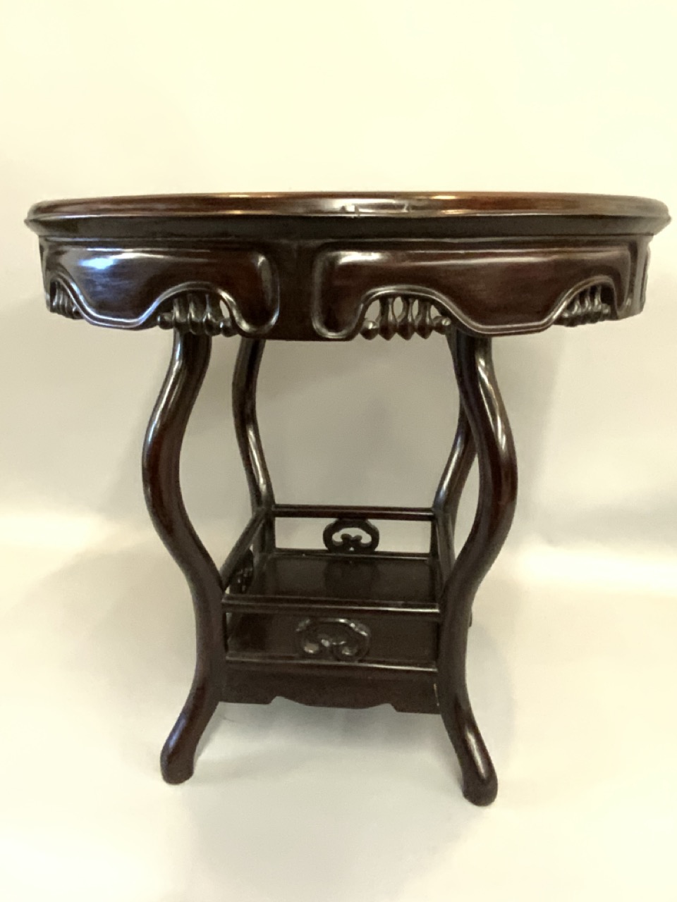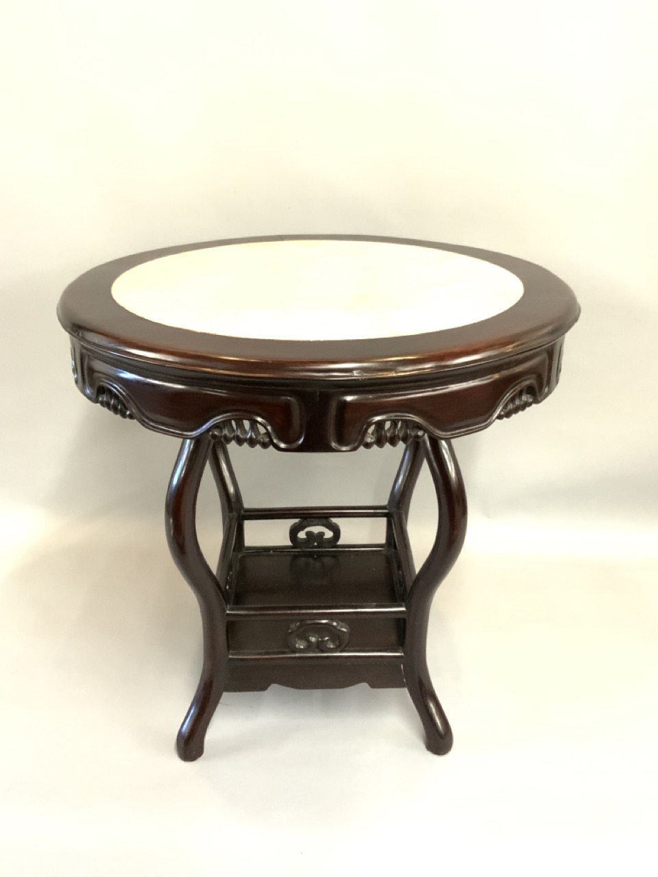 A late 19th or early 20th century Chinese hardwood Round marble top Table. Signed underneath marble All wood fastening tabs to attach top and bottom of table intact. Very fine piece.