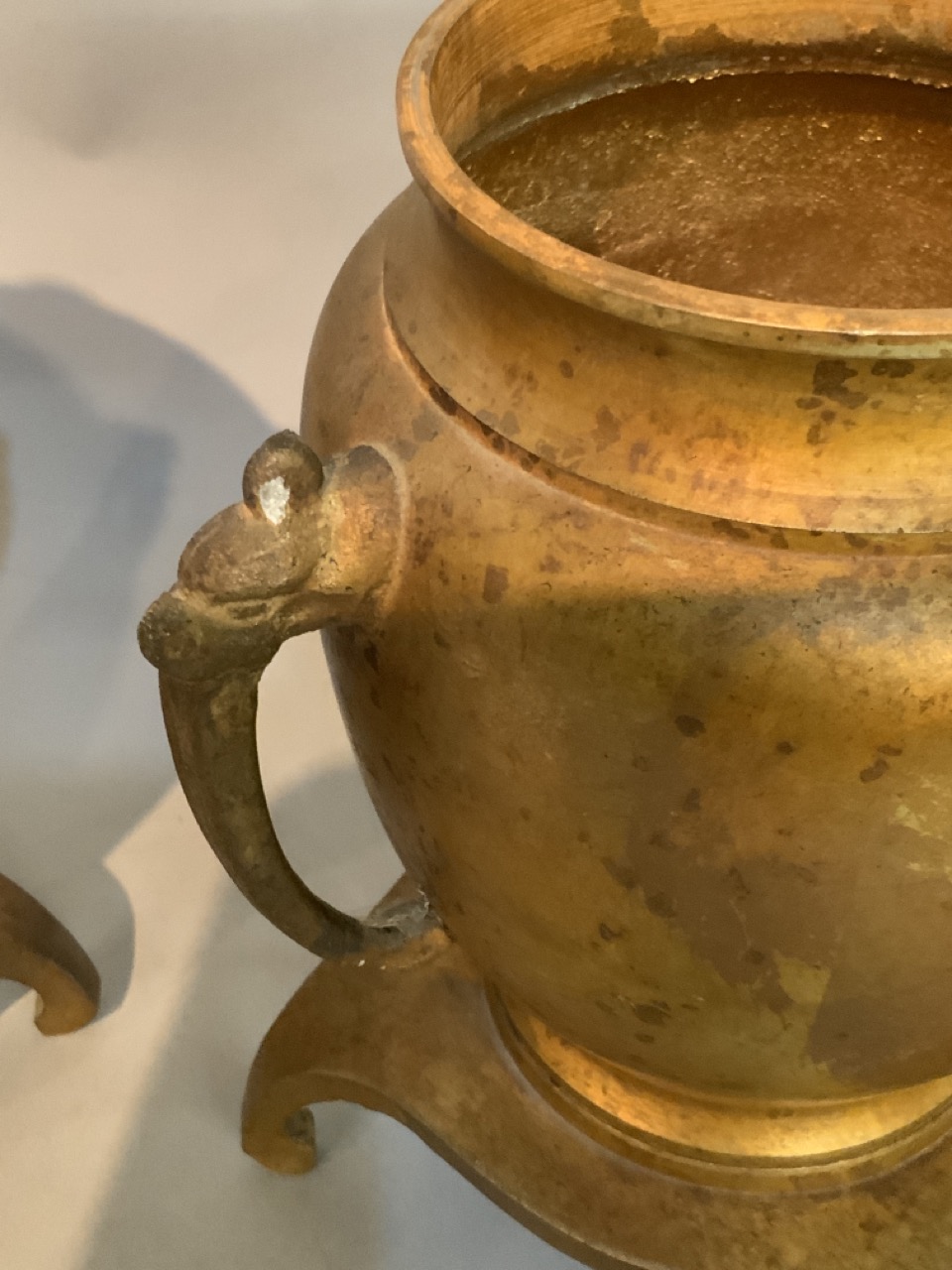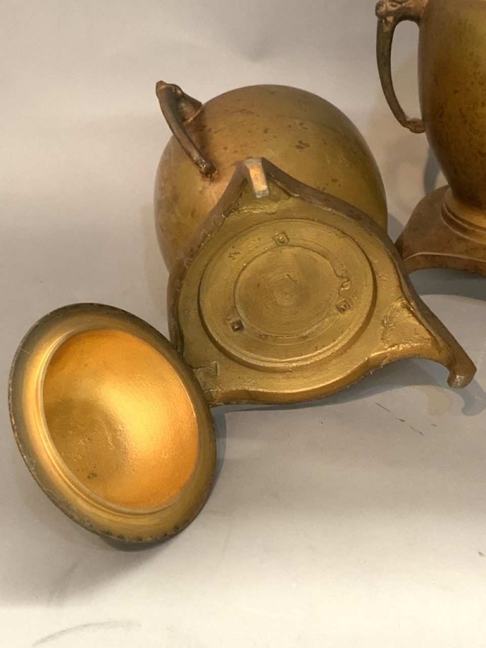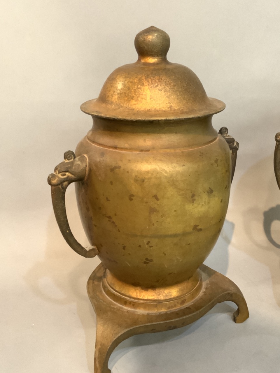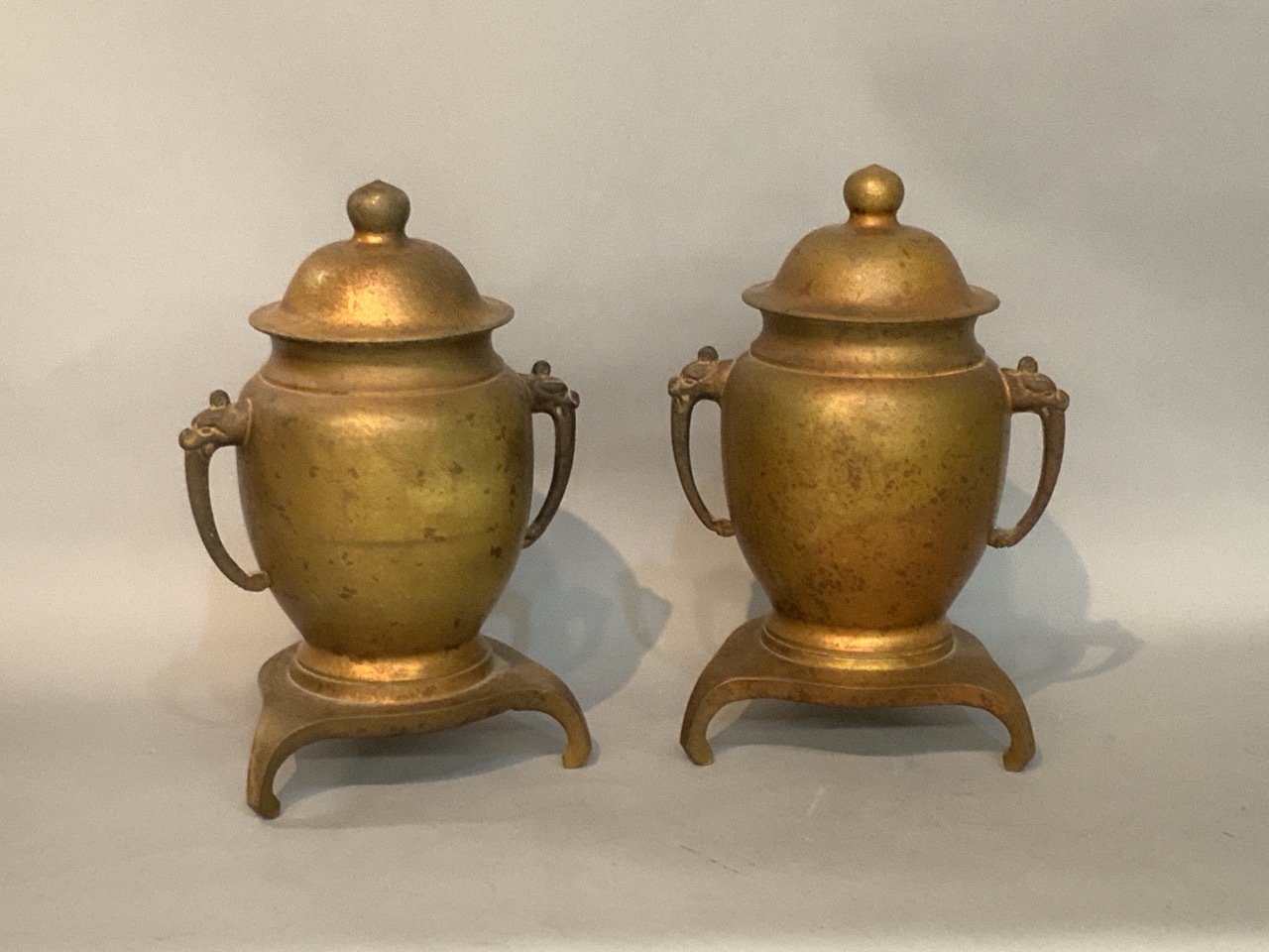 A pair of early 20th century spelter covered urns with Asian influence. Spelter metal finished with bronze patina.