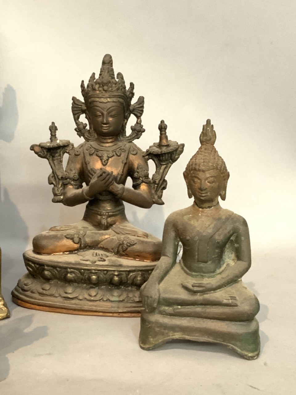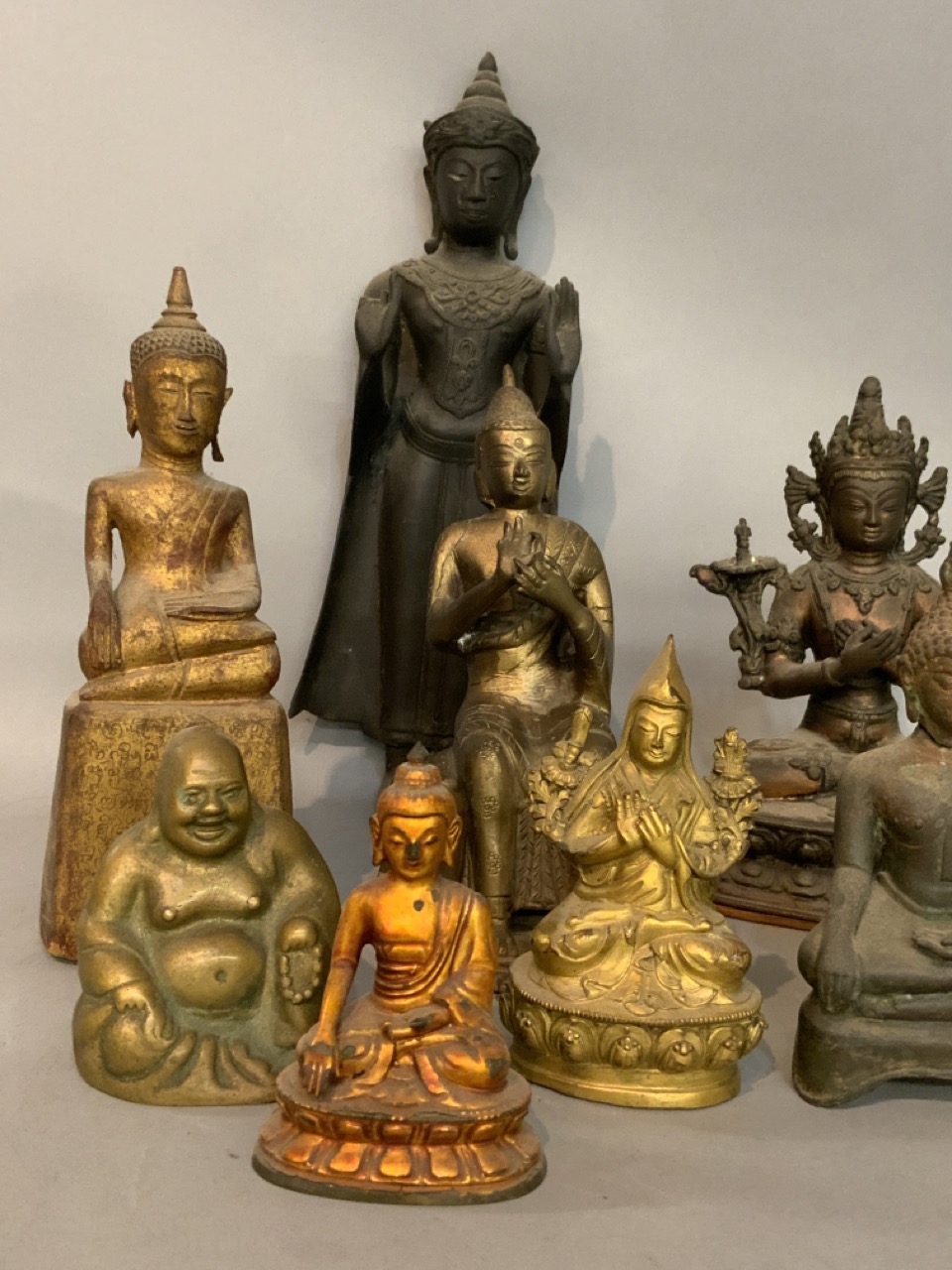 A grouping of statues of Rama and Buddha. As seen in photograph preview. Metal and wood.
