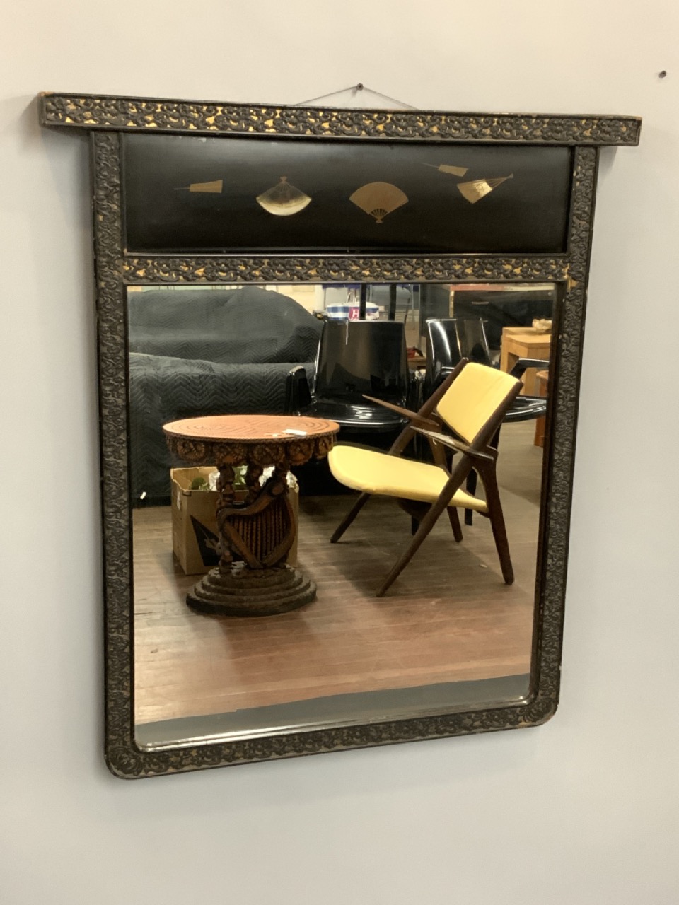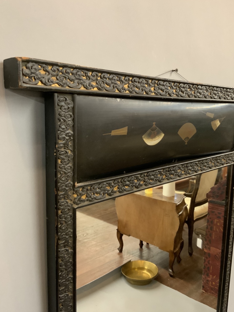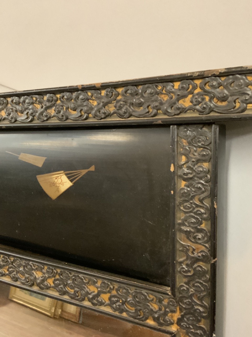 Chinese lacquered wood mirror with ornate paint decorated fans. Early 20th century.