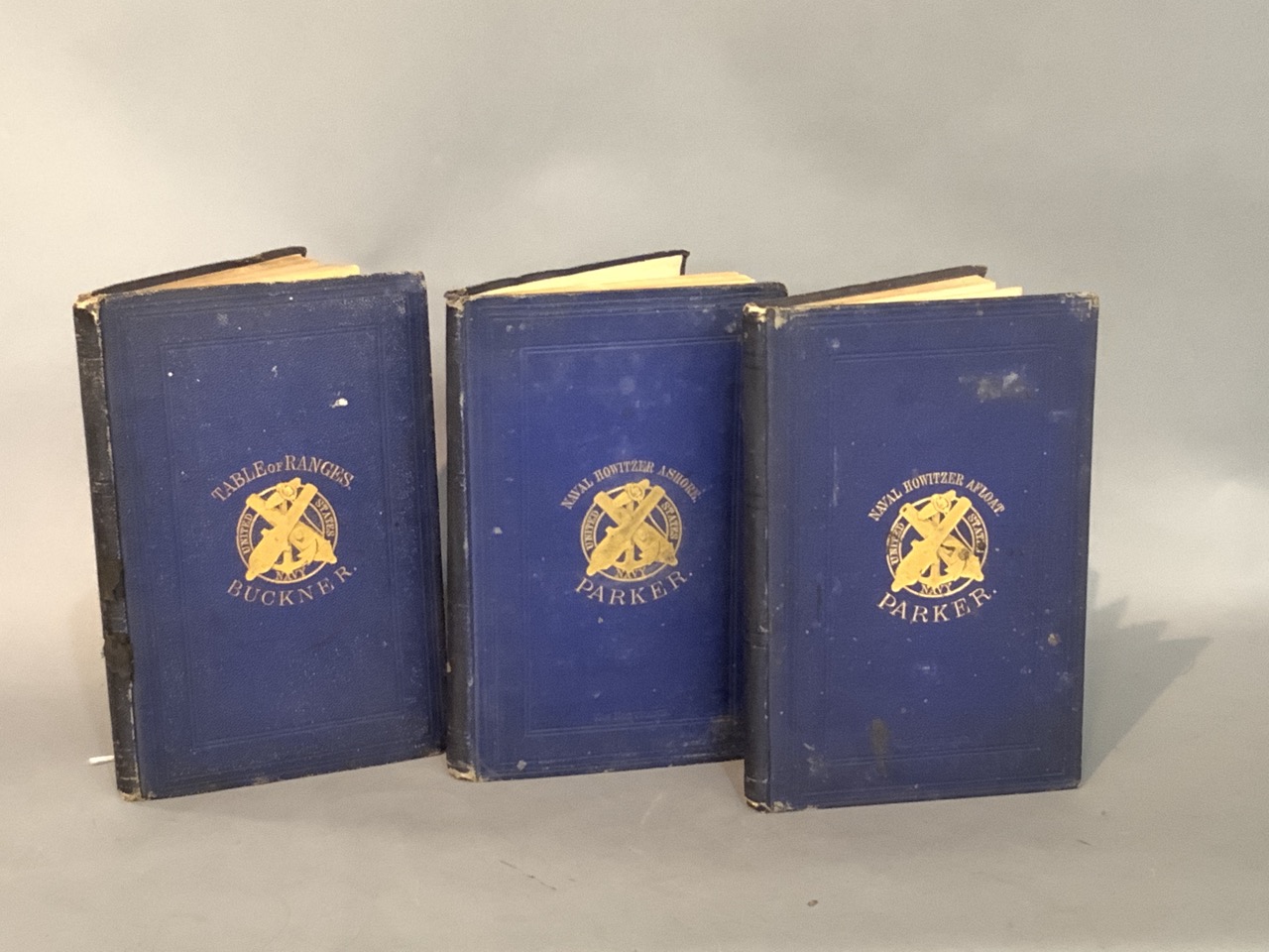 Table Of Ranges by Buckner, Naval Howitzer Ashore and Naval Howitzer Afloat by Parker. Original binding. Good. Some staining.