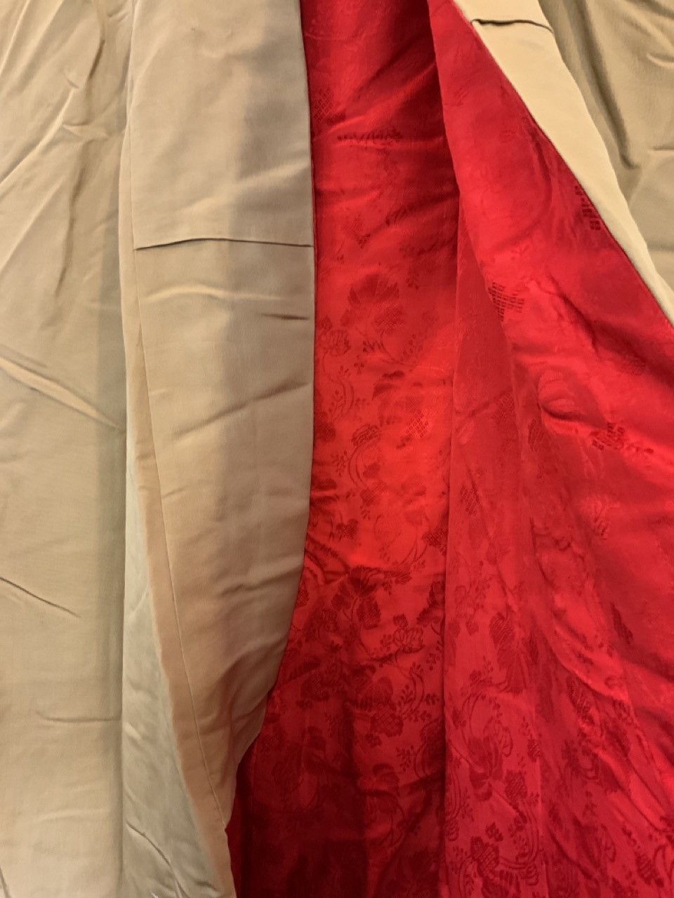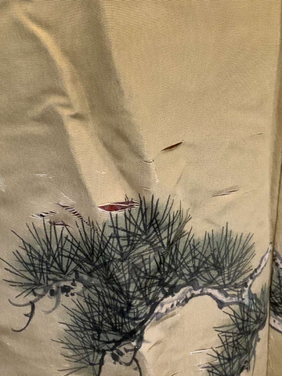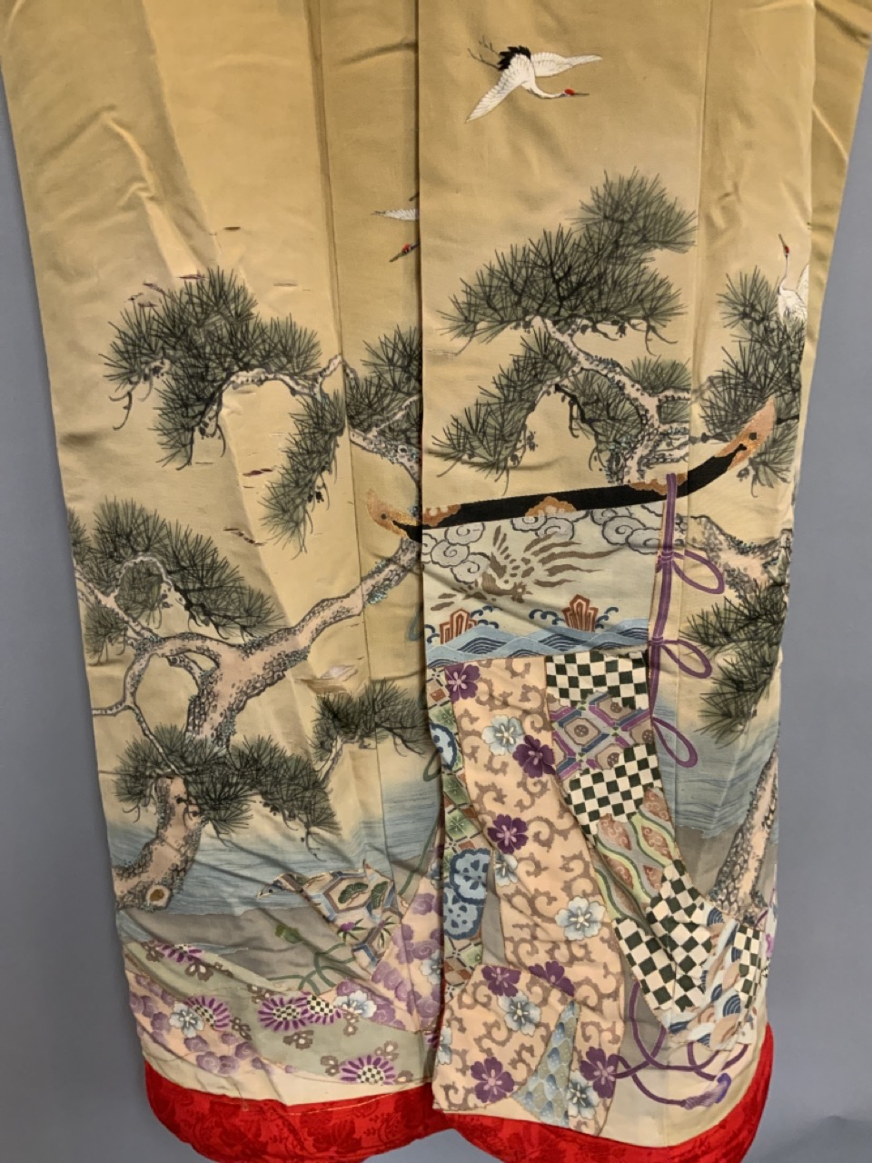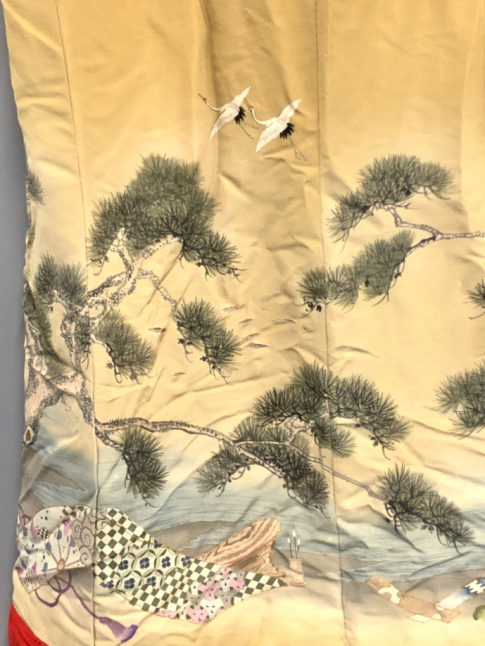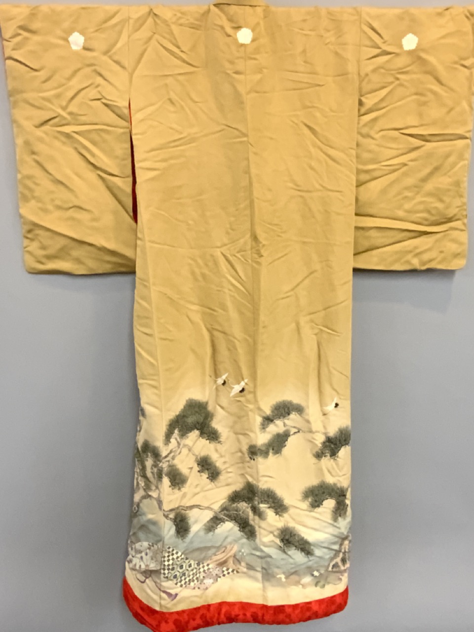 Japanese silk Kimono, mustard color and patchwork style pattern.