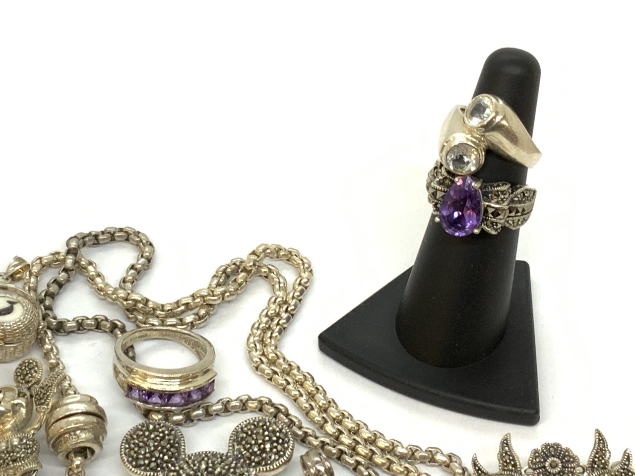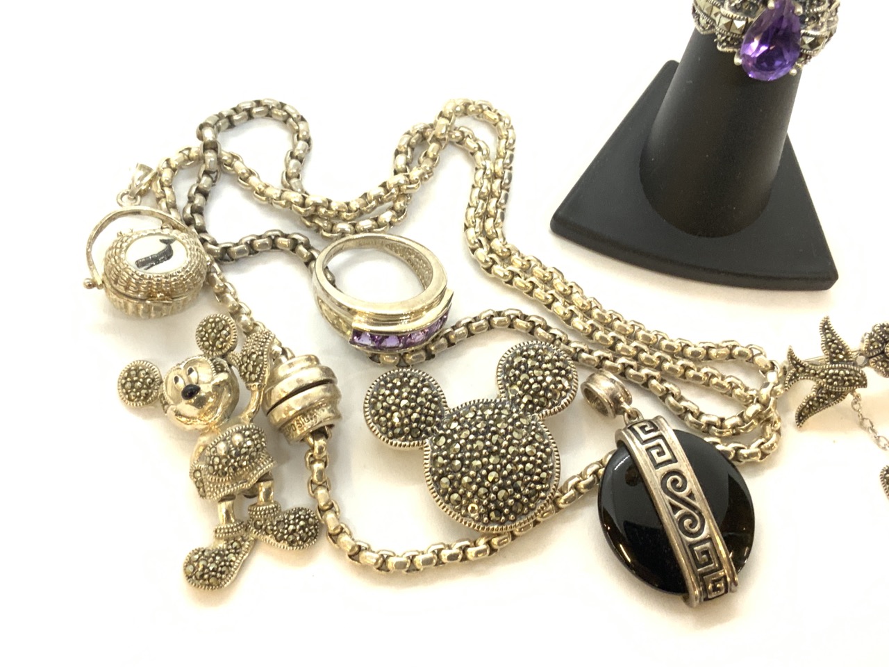 A compiled grouping of sterling silver jewelry. Disney marcasite Mickey Mouse pins, Nantucket basket pendant, necklaces, amethyst rings etc.