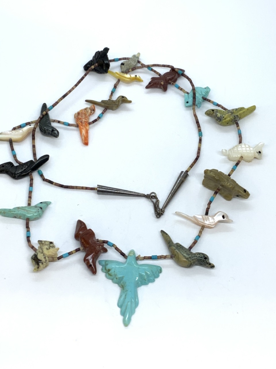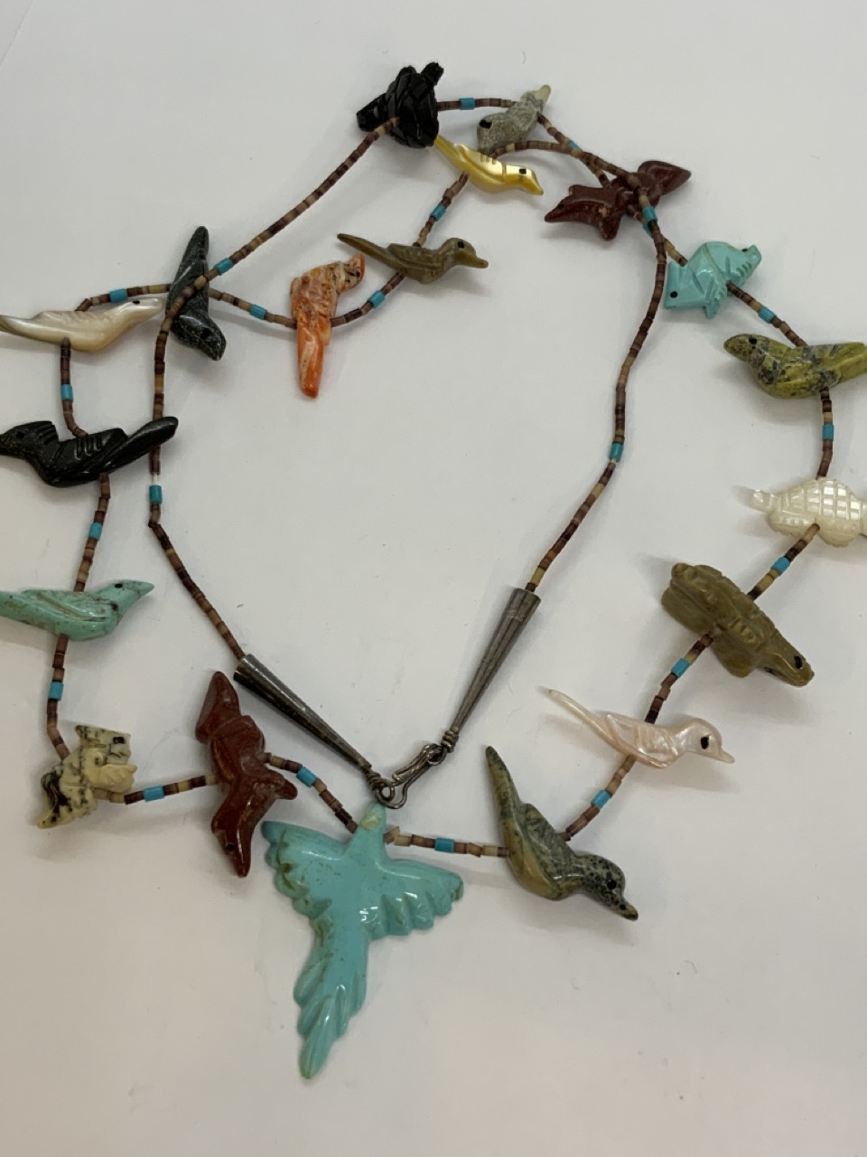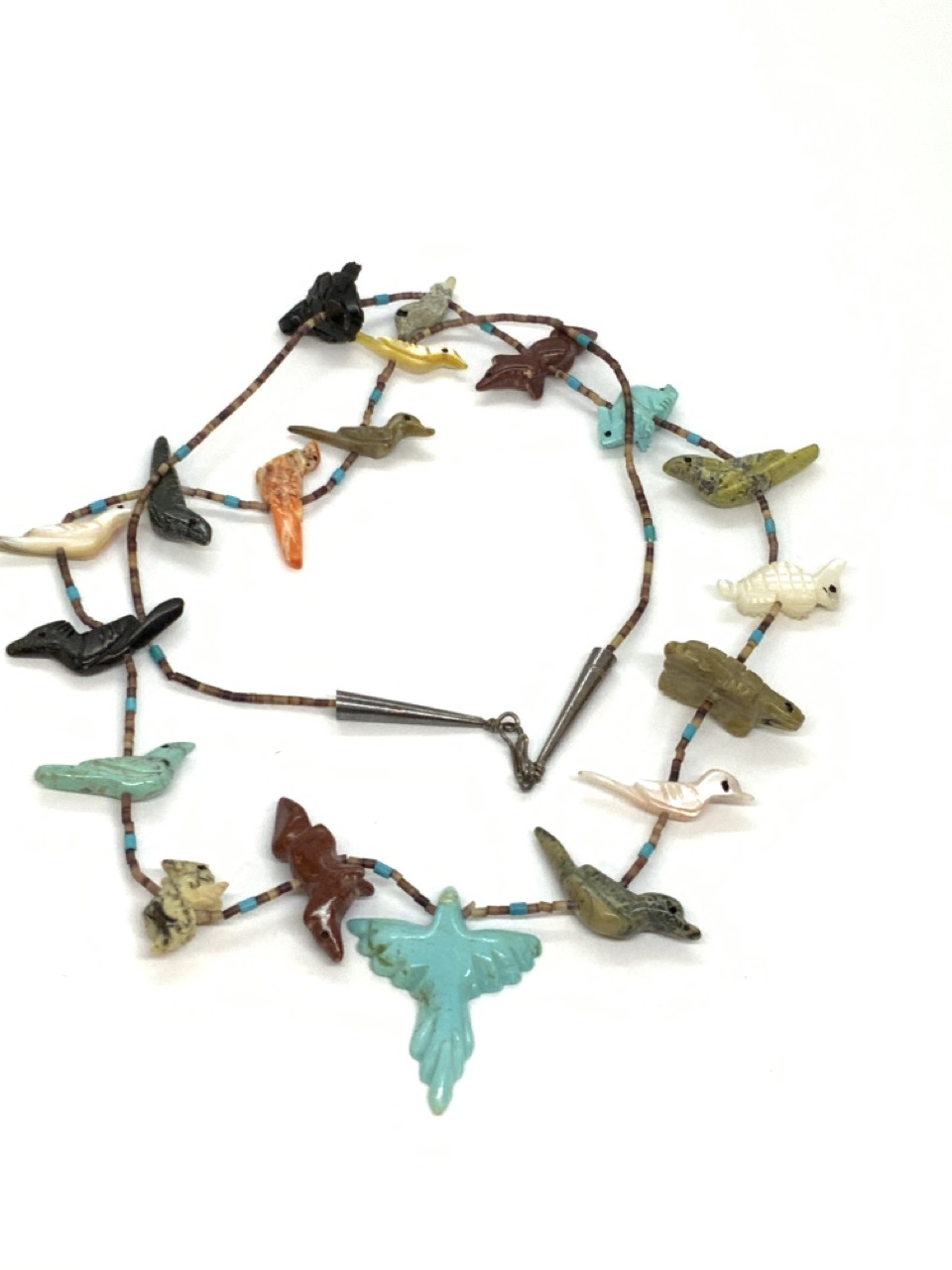 A Zuni tribe necklace with coral, turquoise, onyx birds etc.