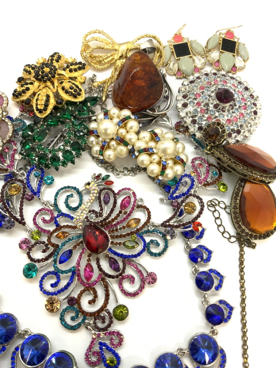 Costume jewelry lot. Contemporary and vintage. No stones appear missing however it is possible after closer inspection due to large amount of detailed small stones.