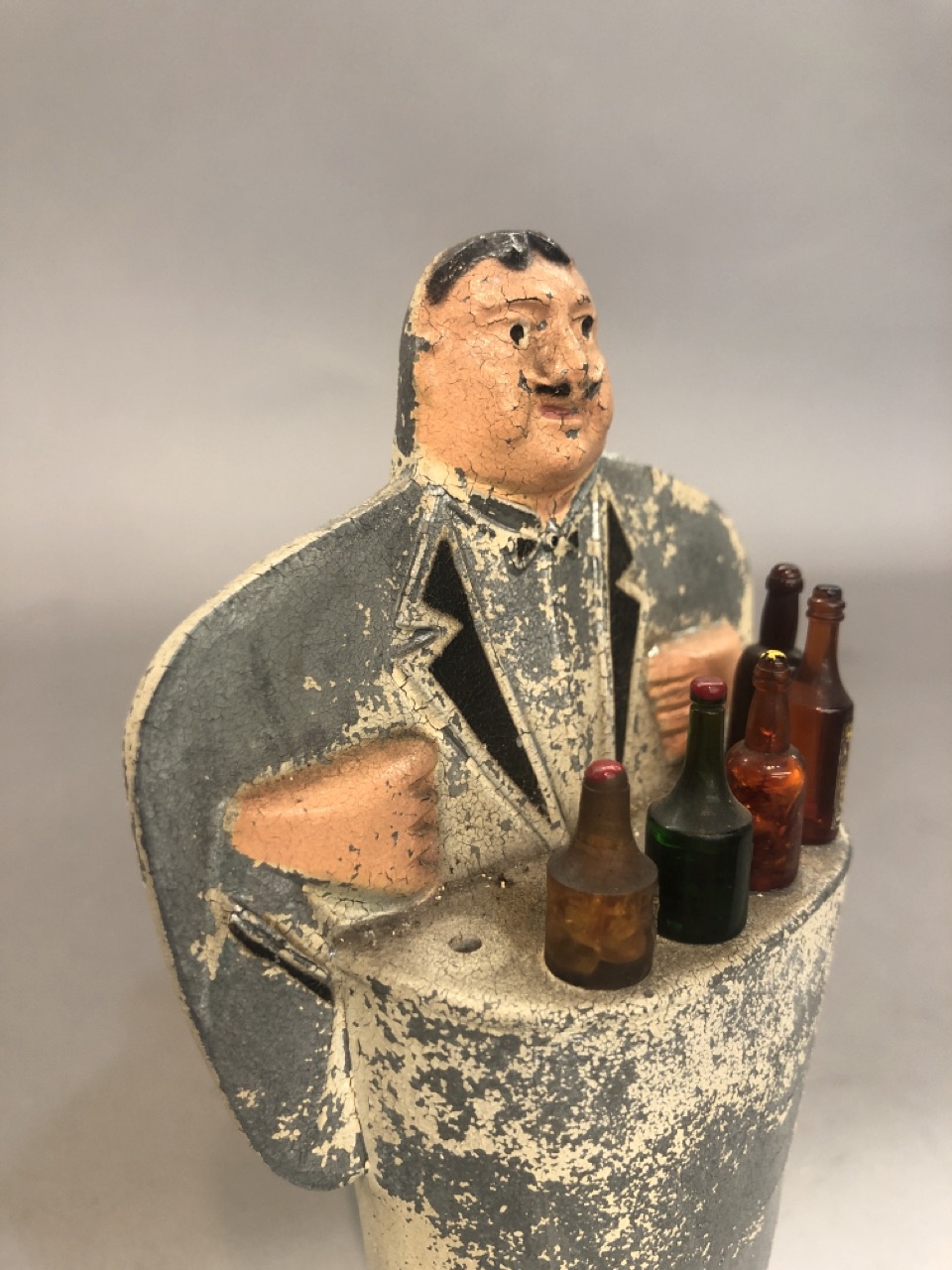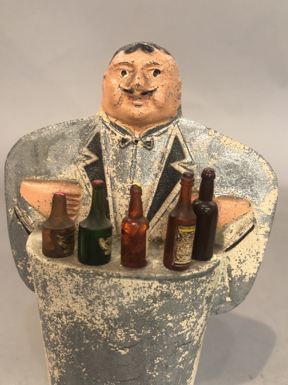 A figural spelter metal bartender cocktail pick holder with liquor bottle top picks. One pick missing.