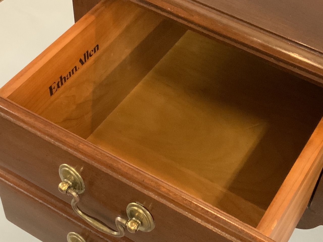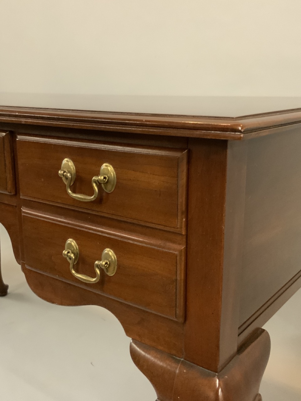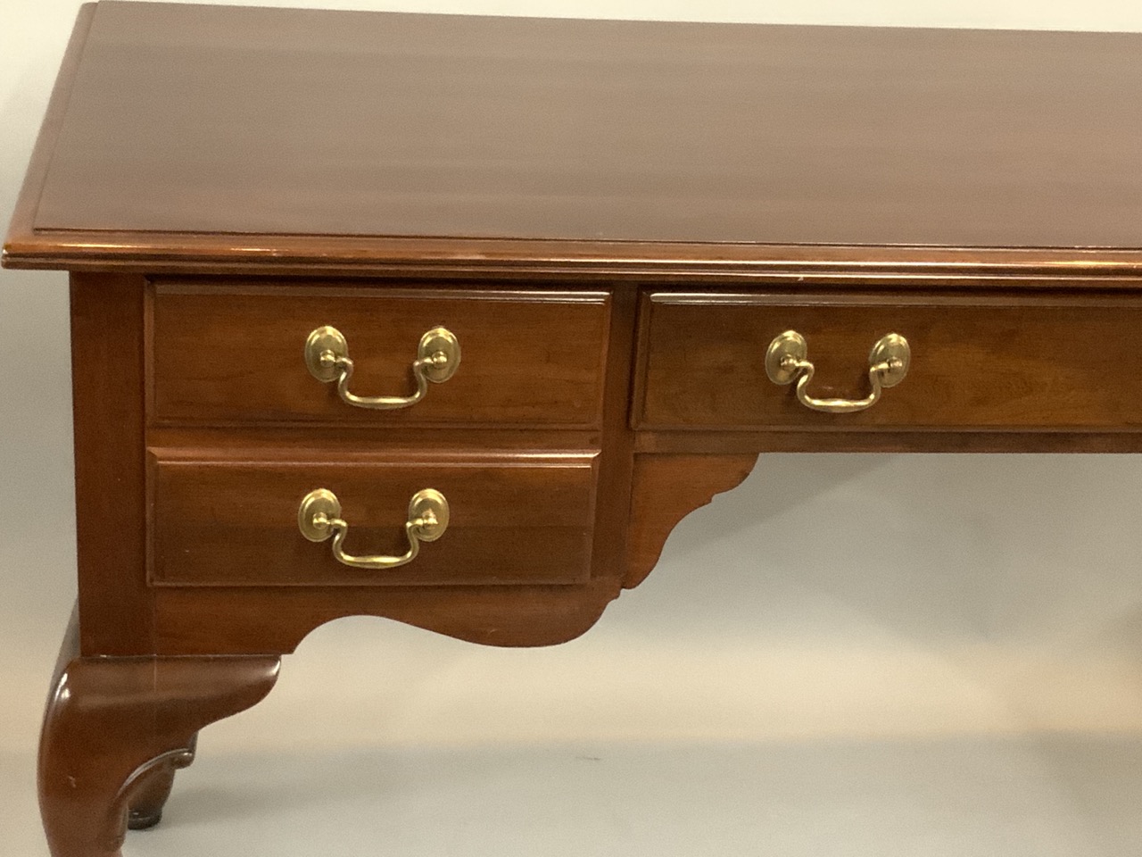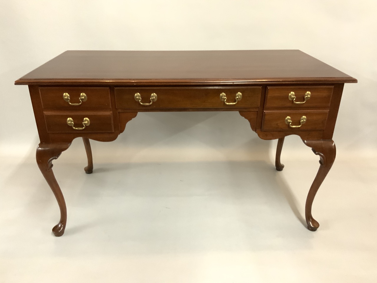 Ethan Allen cherry wood writing desk with Queen Anne legs and brass pulls.