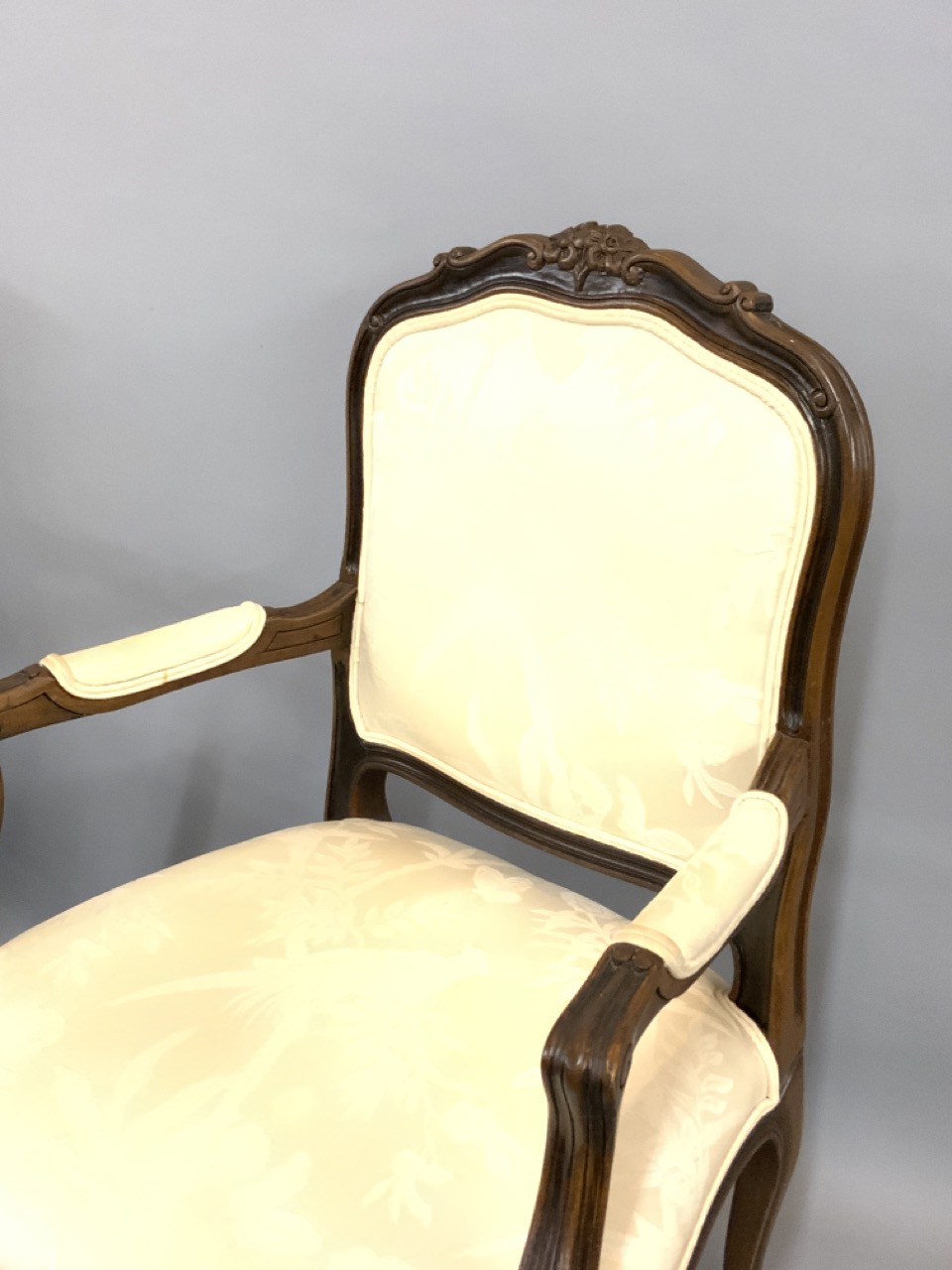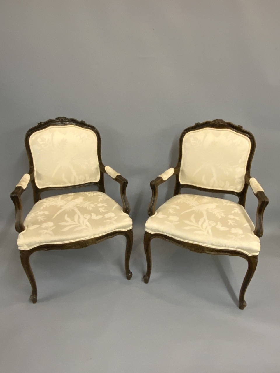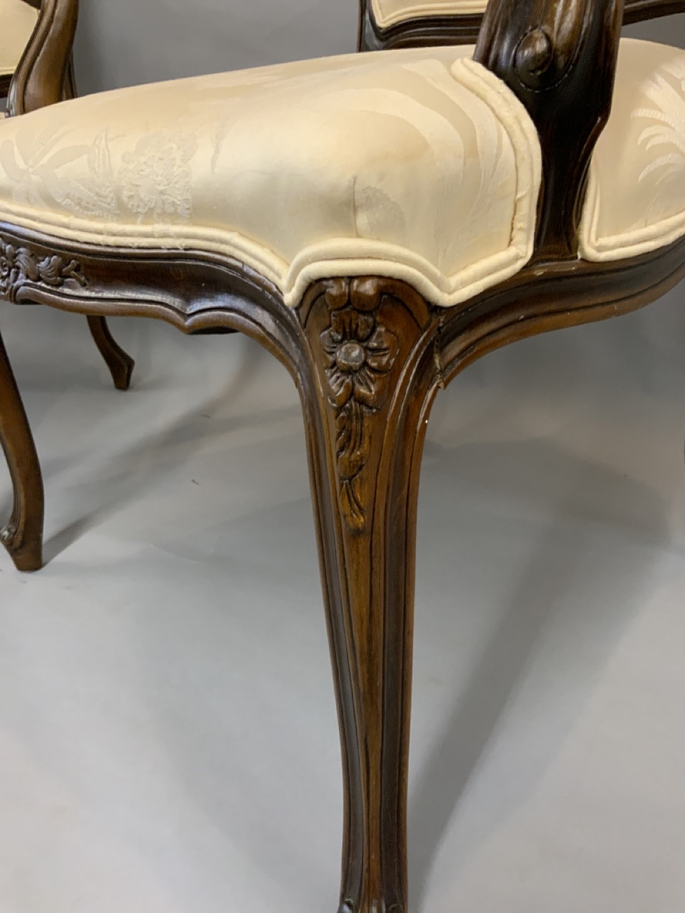 Louis XV style Ethan Allen upolstered arm chairs.