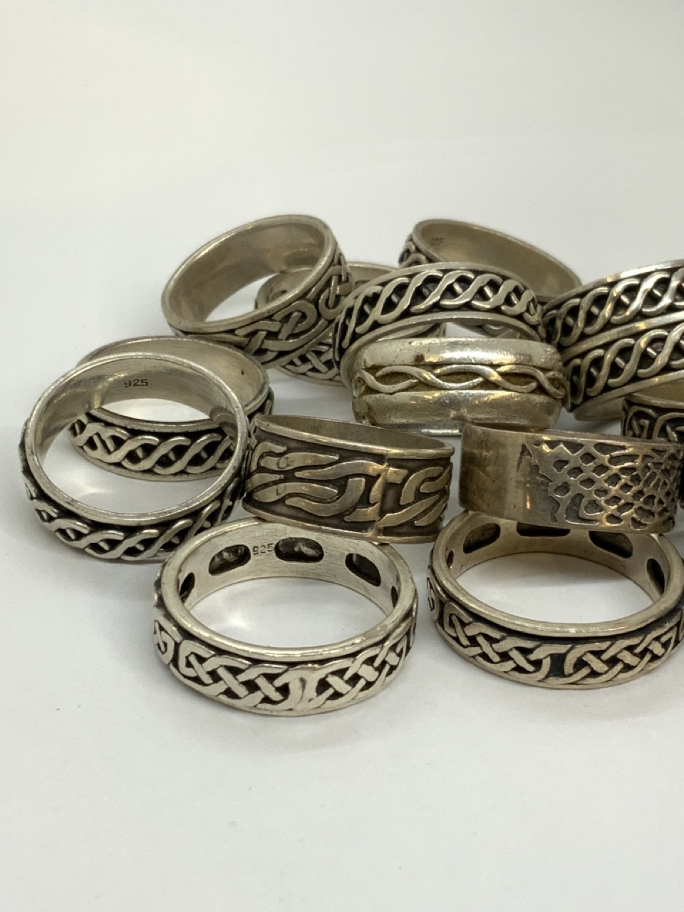 Sixteen (16) piece mens sterling silver rings. Most having eternity type engravings.