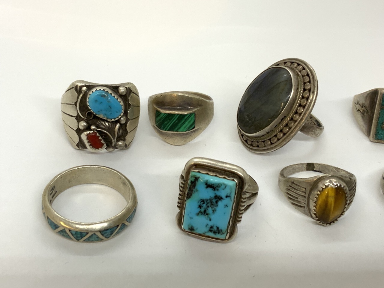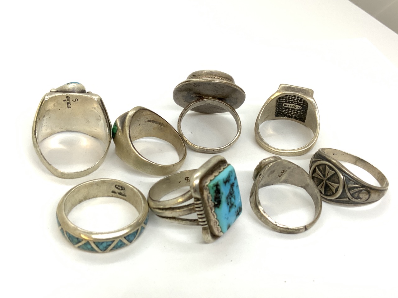 Eight (8) piece men's sterling silver ring lot. Cats eye, turqouise, coral and malachite stones. Indian and Mexican.