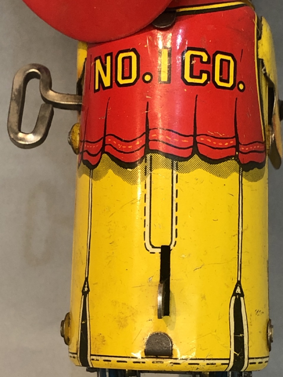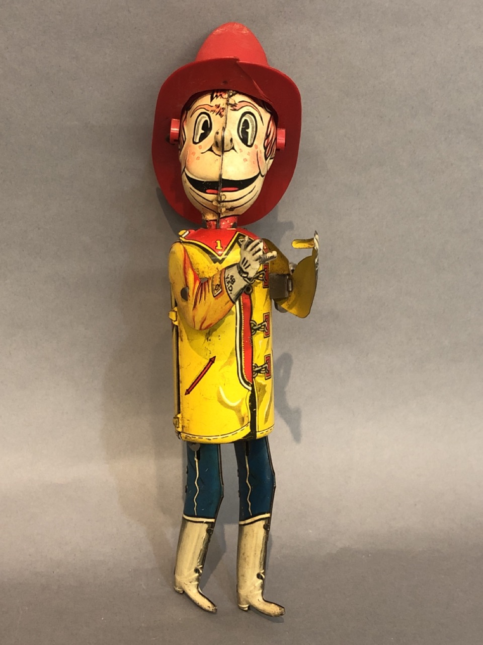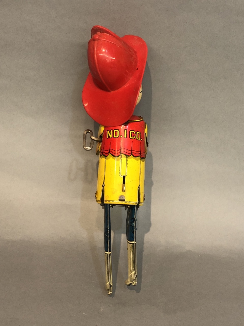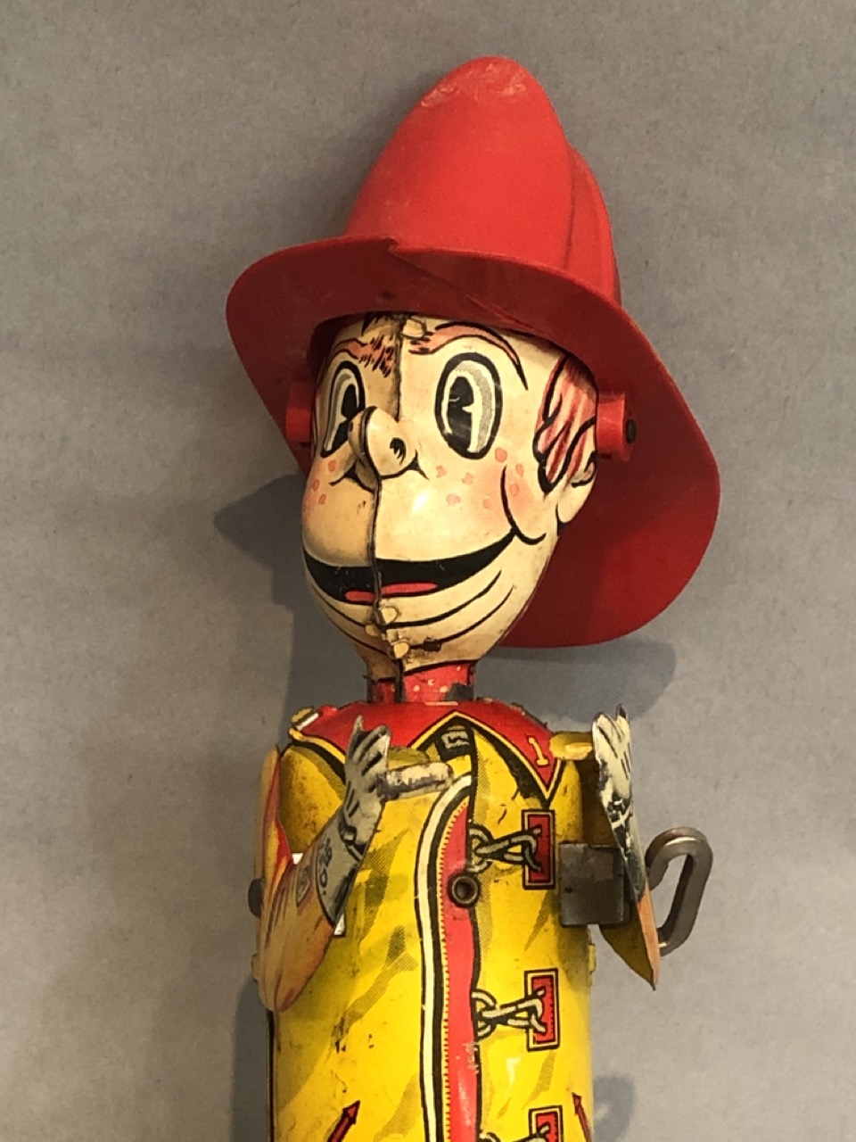 Vintage Windup fireman who would be climbing ladder. Ladder missing.