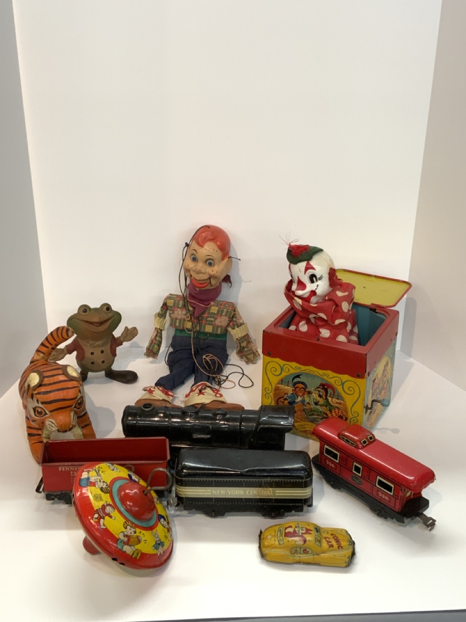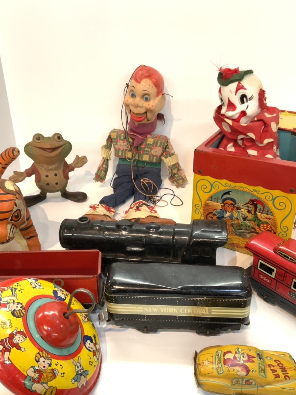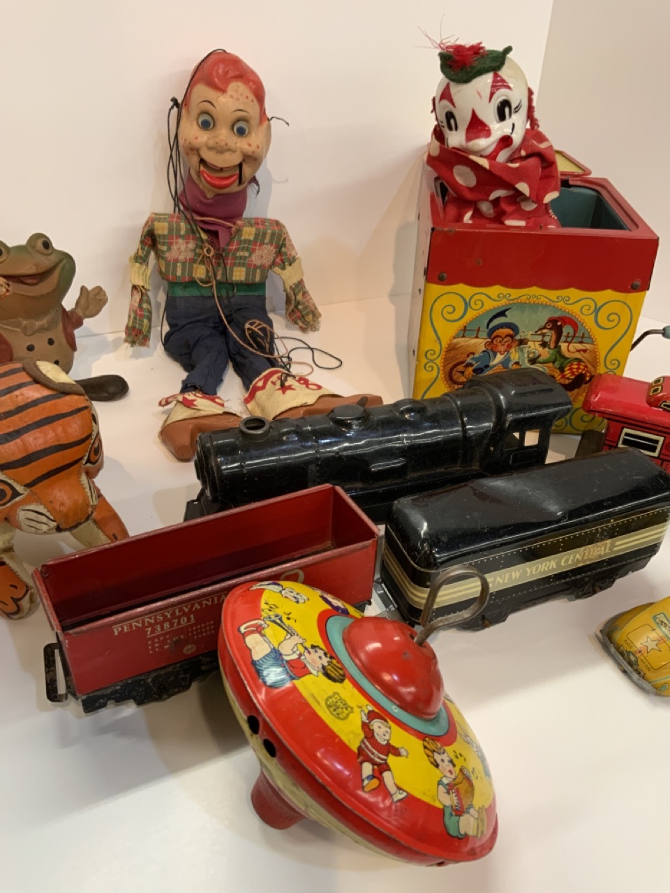 Vintage toy lot including Howdy Doody marionette, Mattel Jack In Box, New York Central Marx train set (dents noted) and other toys.