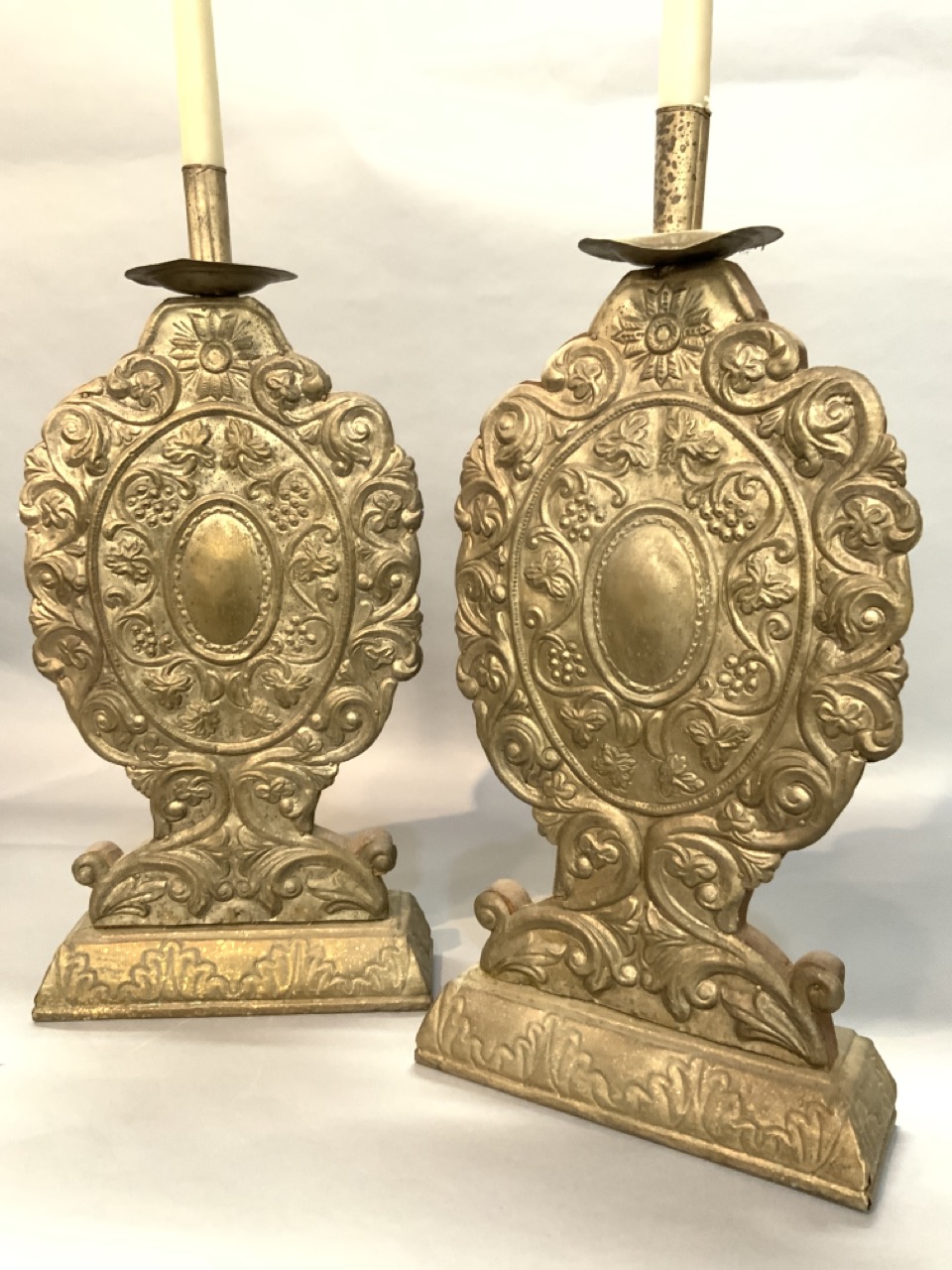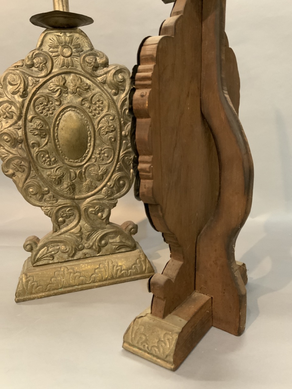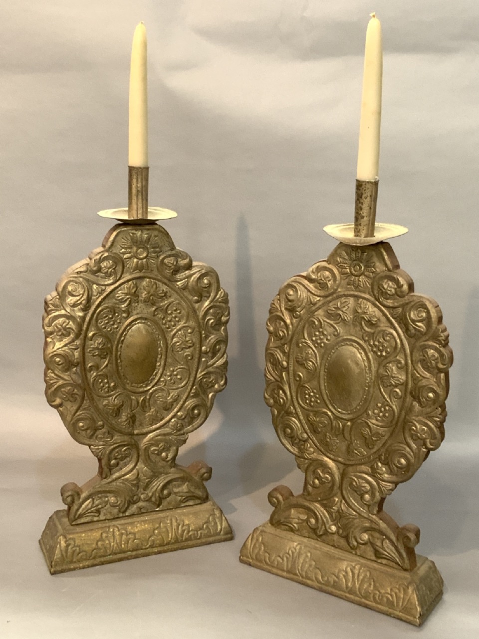 An exceptional paire of oversized mid 19th century Americana punched tin with pine wood backed candlesticks pair. Large size handles to carry along.