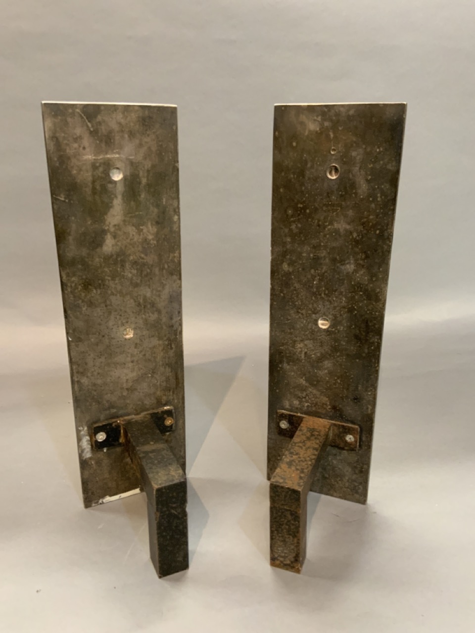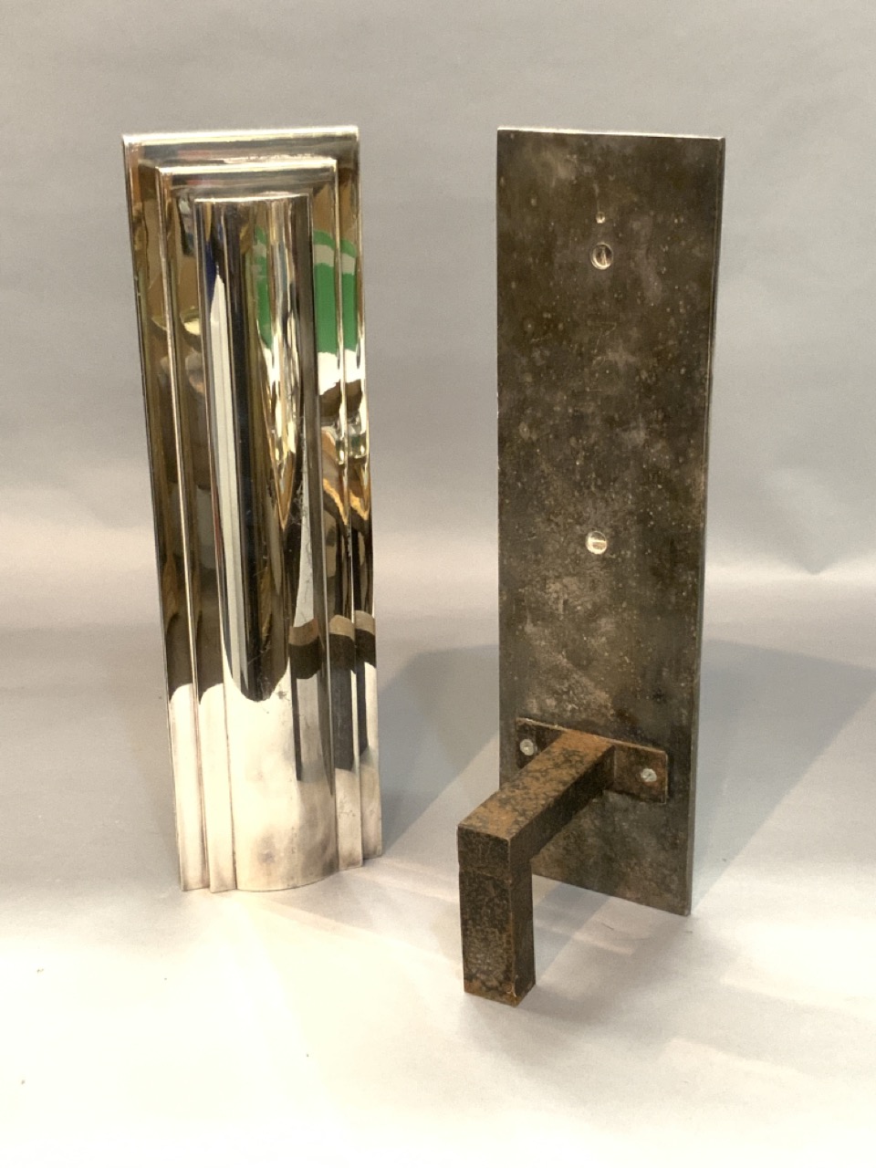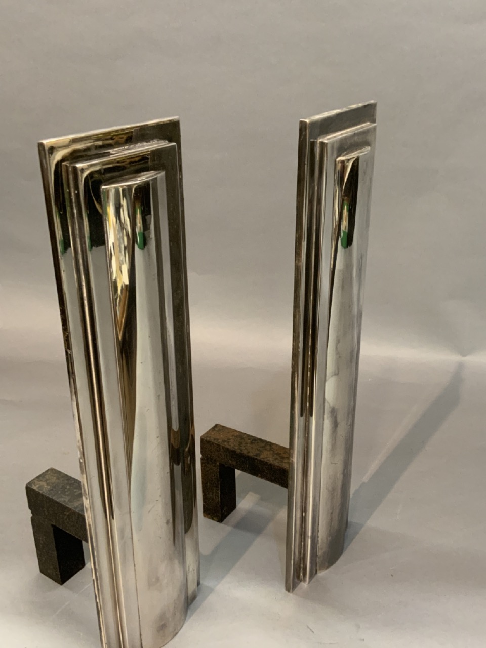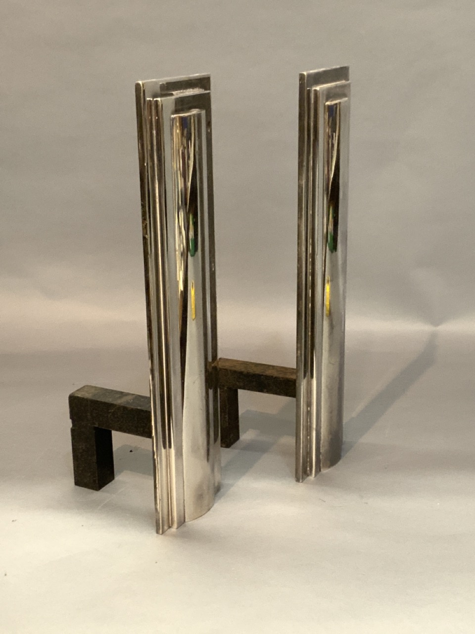 Art Deco polished chrome plated steel andirons. True to period c.1930. Unsigned.