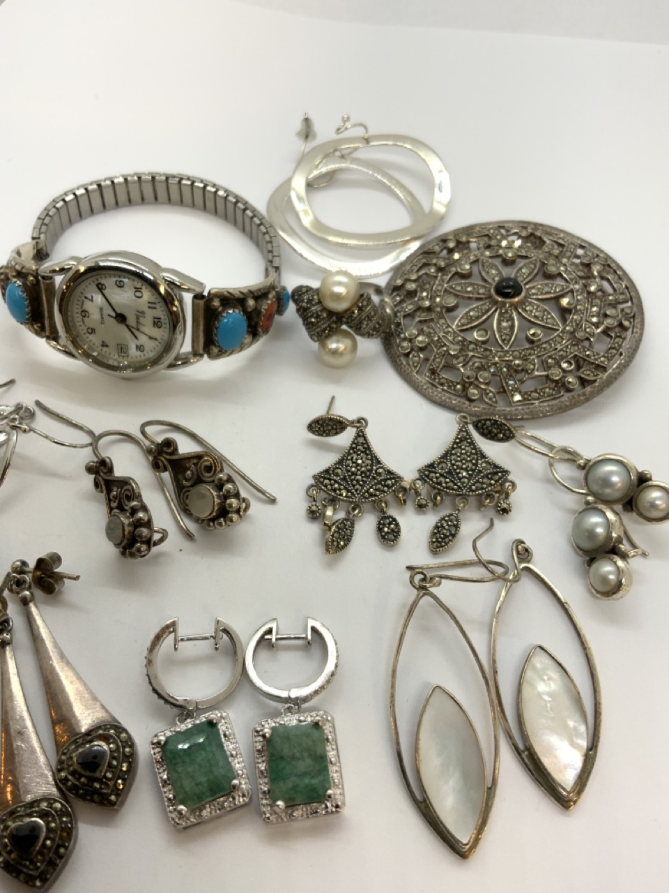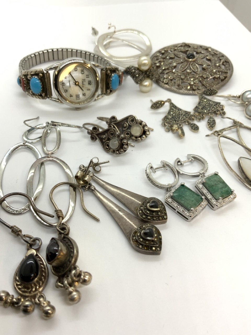Sterling silver jewelry grouping including marcasite pin, earrings and ring, garnets, moonstones and Indian watch. As seen in photograph preview.