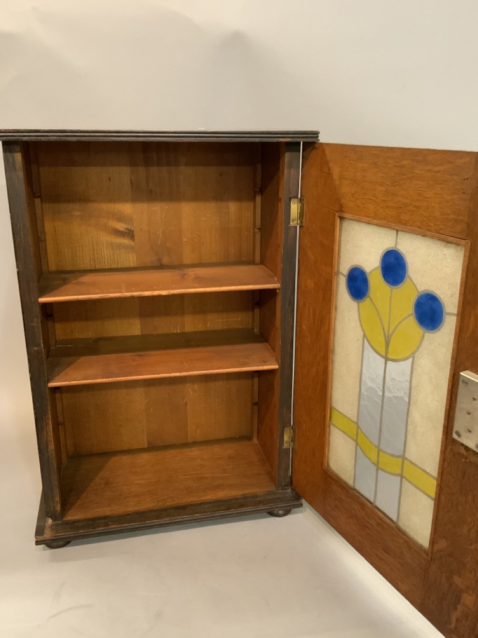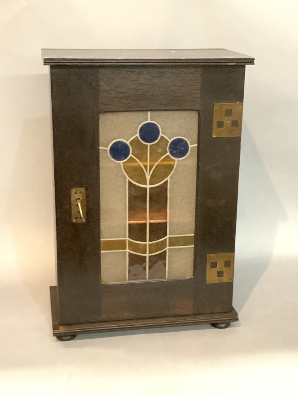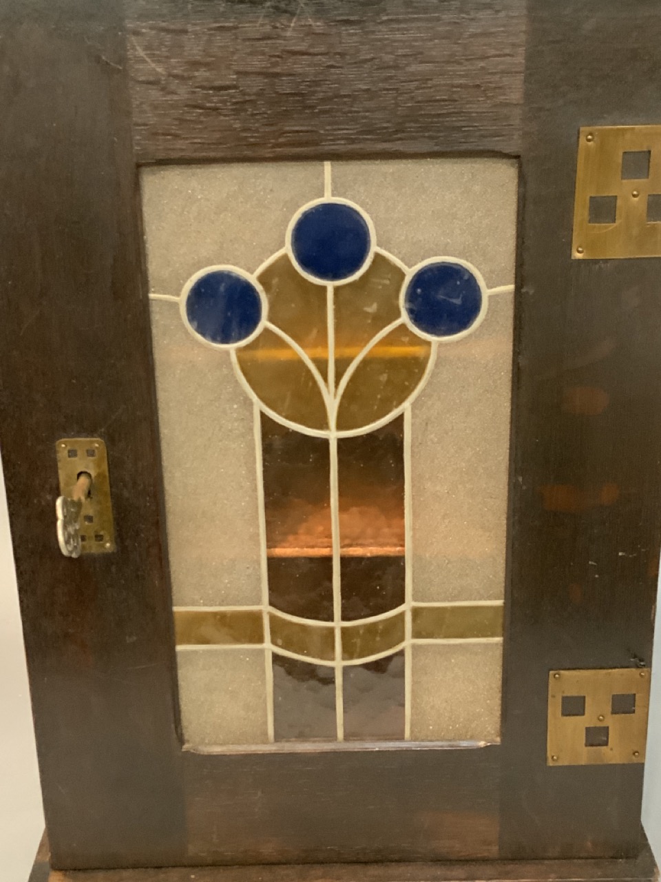 Arts & Crafts stained glass oak medicine cabinet. Very fine constructions with brass hardwarees, lock with key set on bun feet.