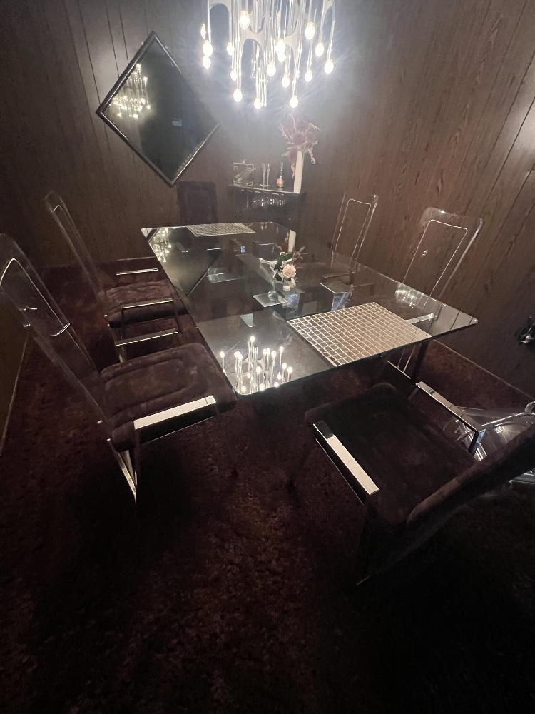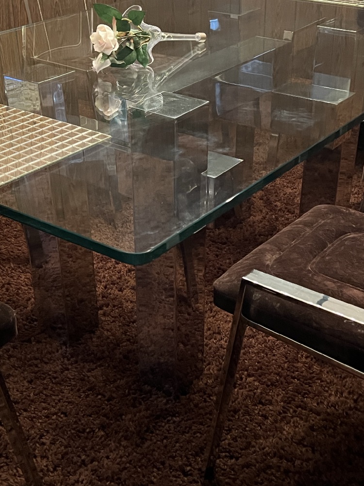 Chrome and Glass Top Dining Room Table c. 1970's w/ Six Chairs.