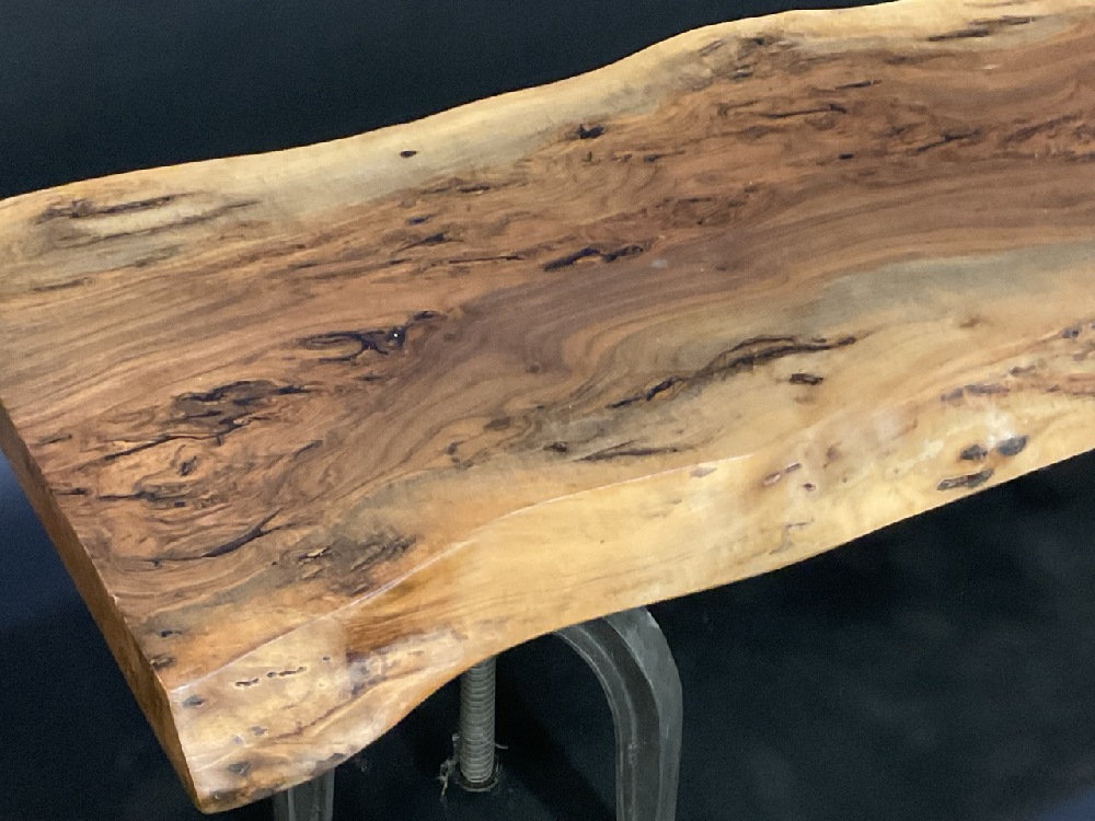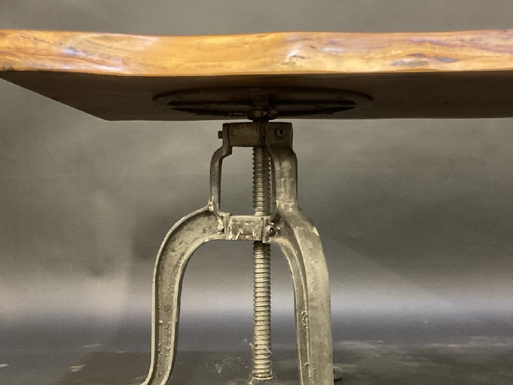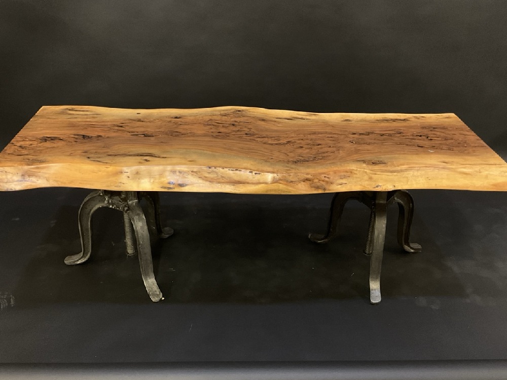 A Fine Black Walnut Slab Table Top or Bench Seat with Double Stool Bases, Cast Iron.