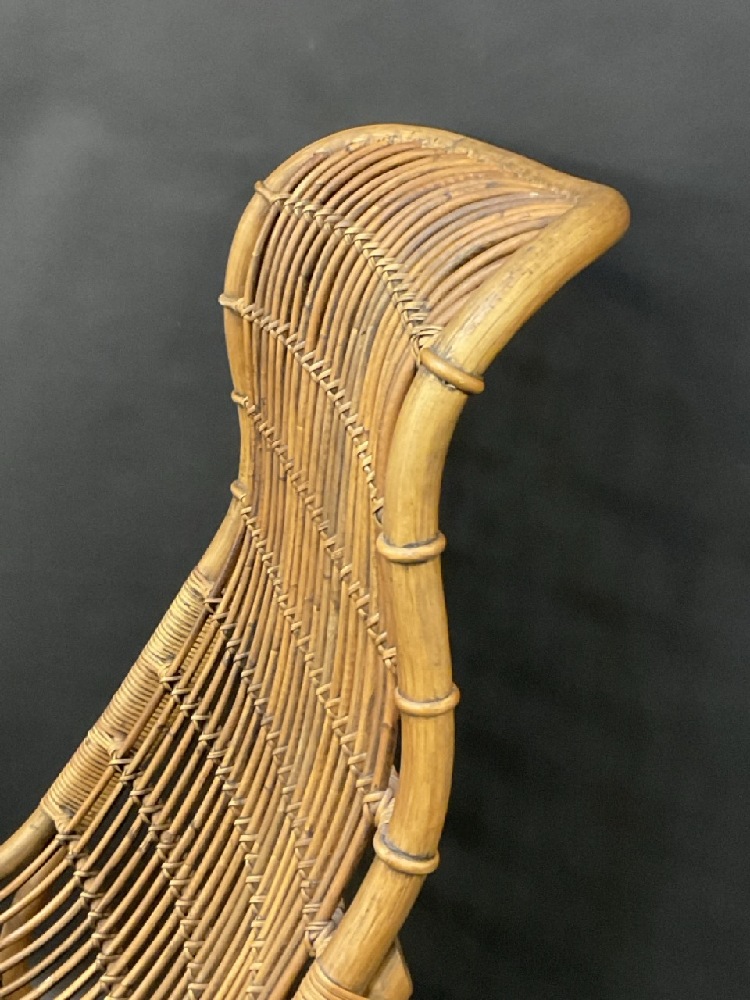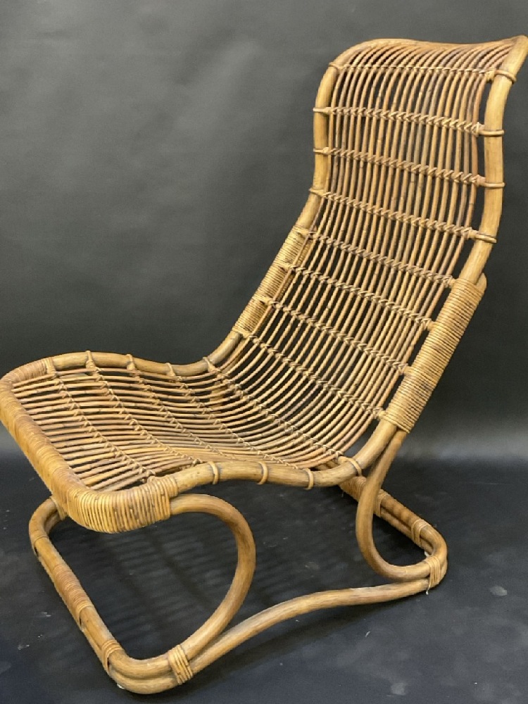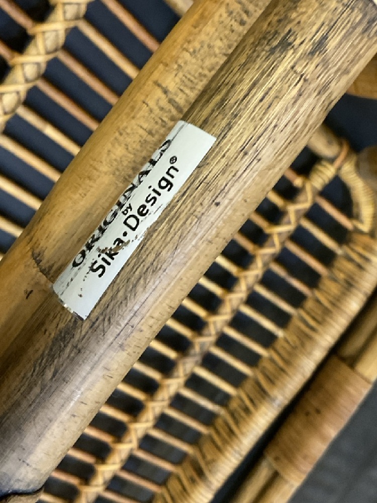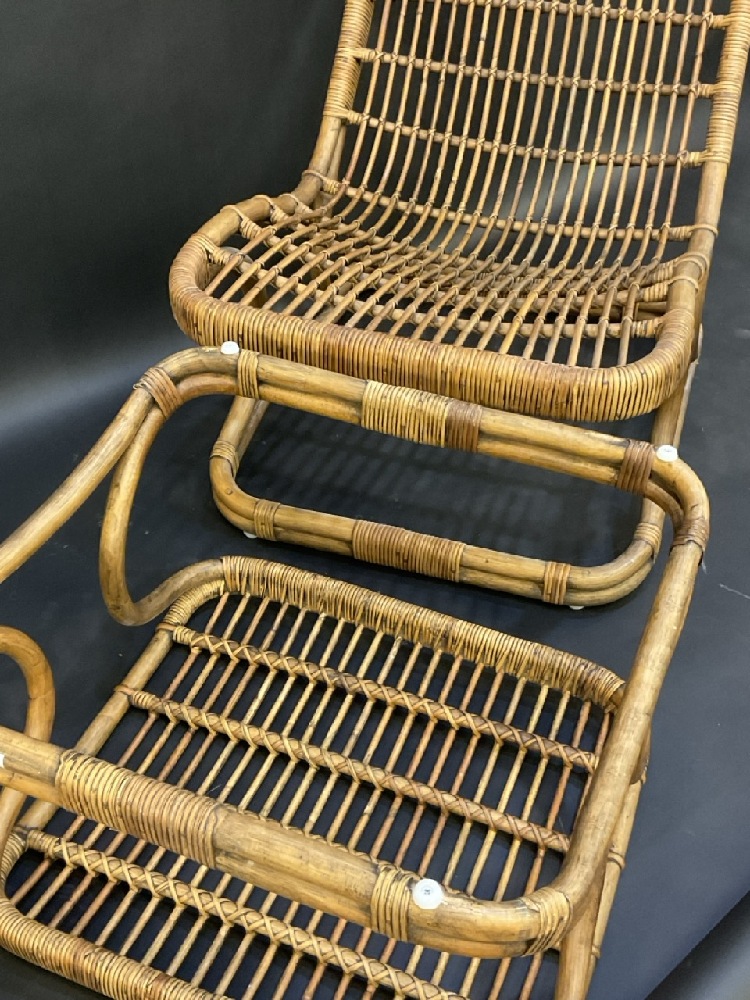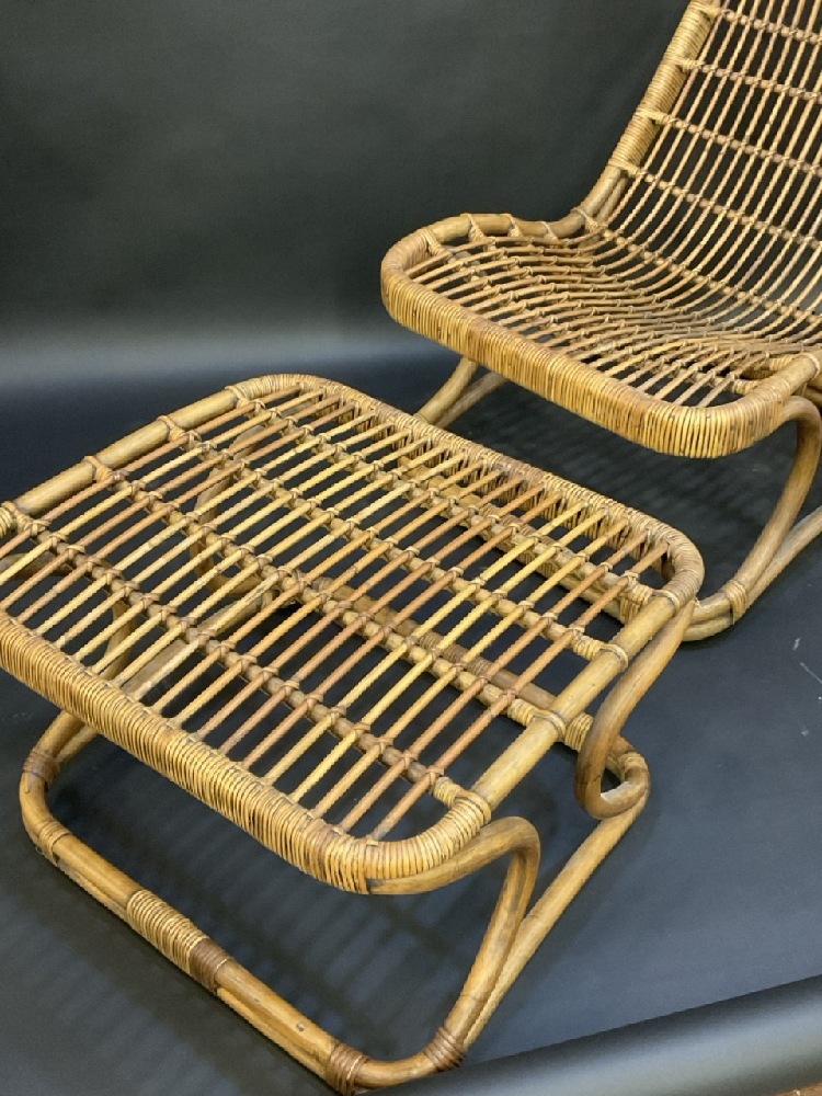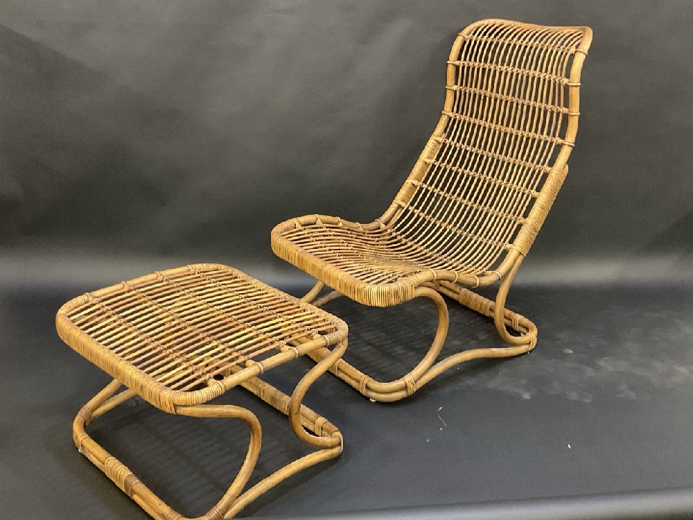 A fine bentwood rattan lounge chair with ottoman. Signed Originals by Sika