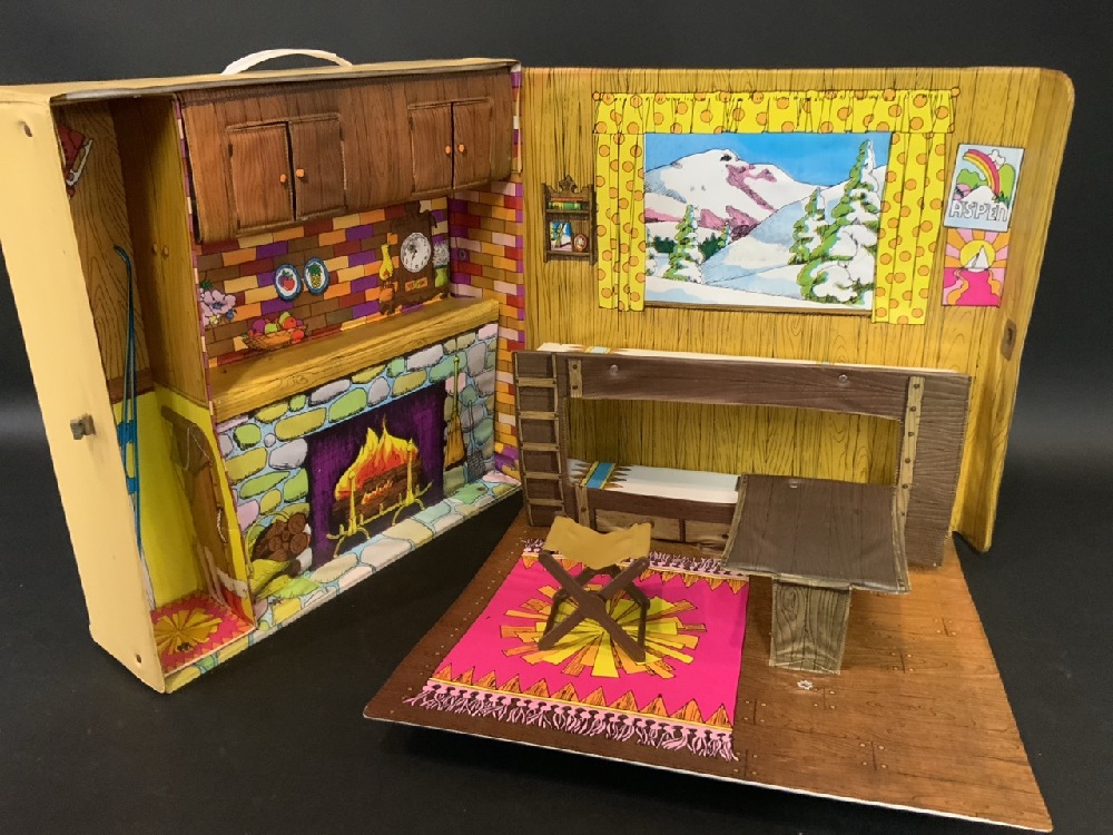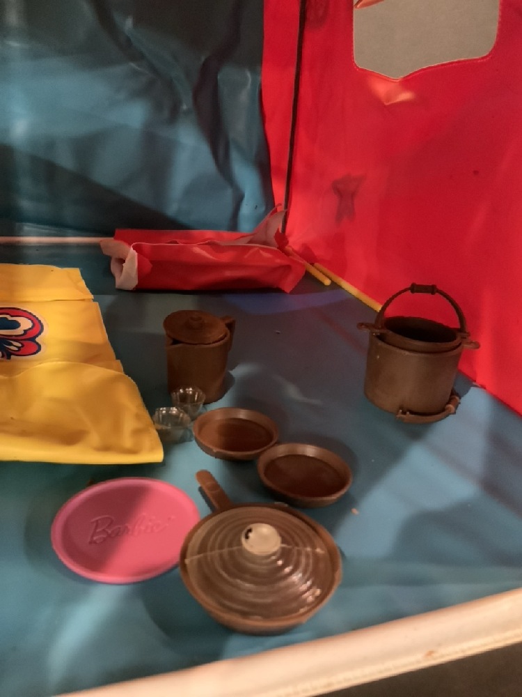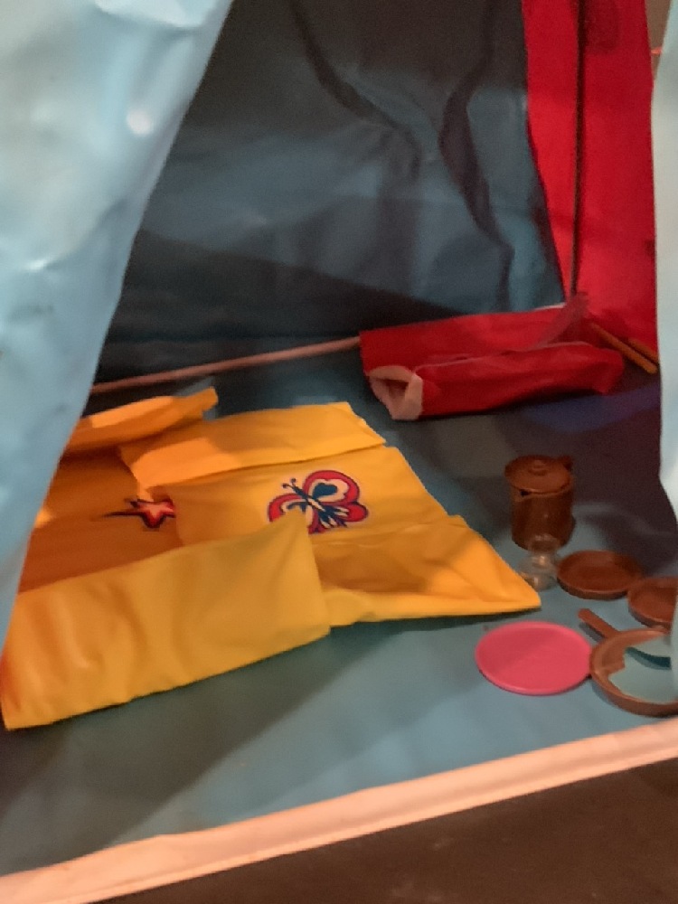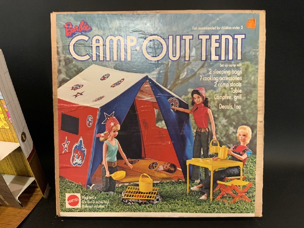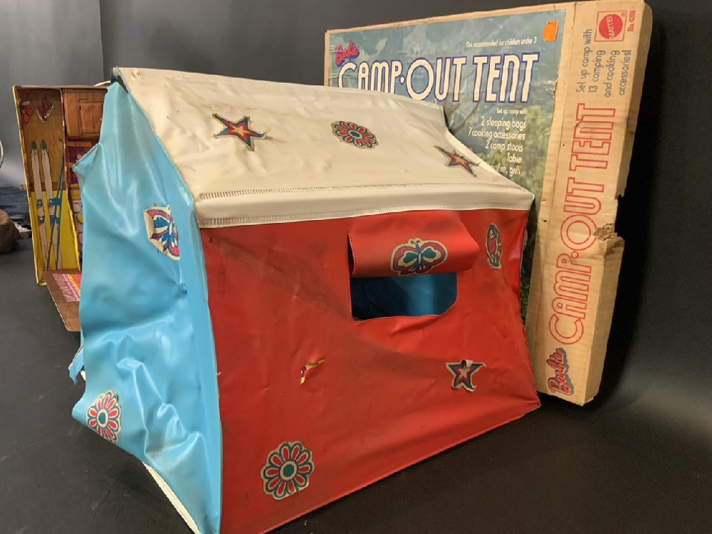 Both the Camp Out Tent and Mountain Ski Cabin have visible wear from age and are missing some accessories. Overall good condition.