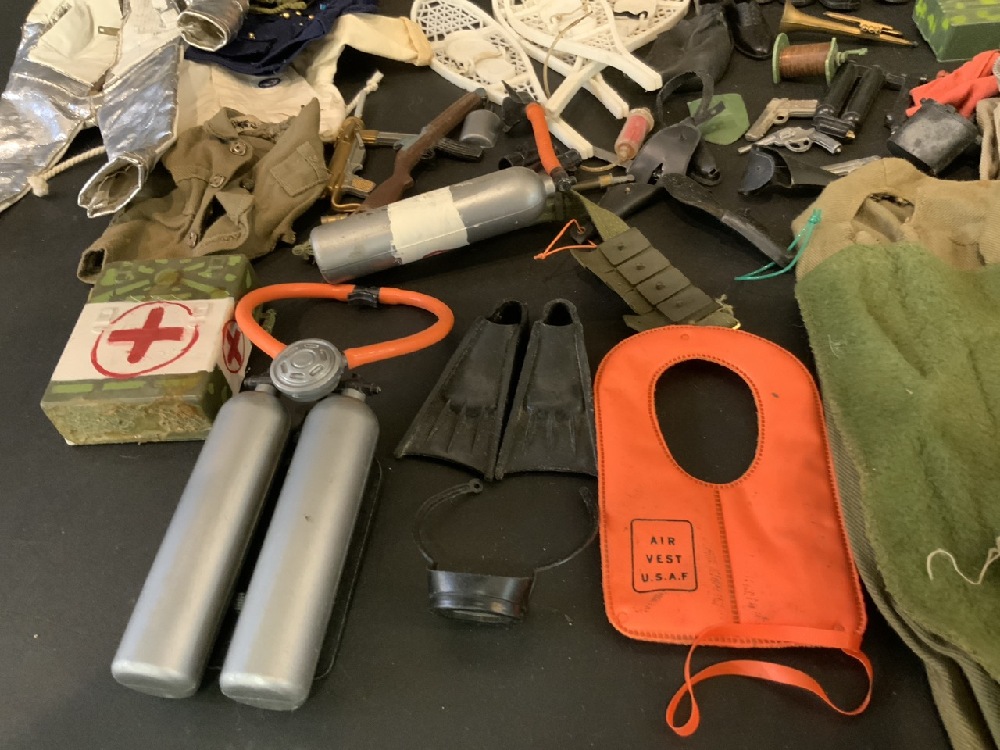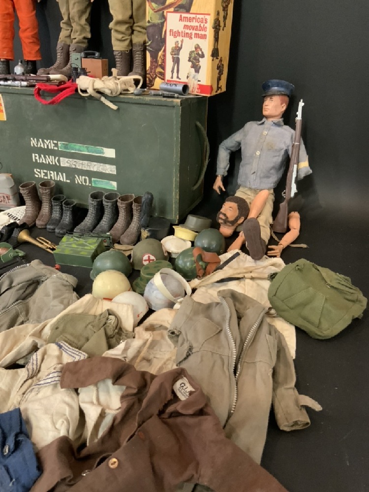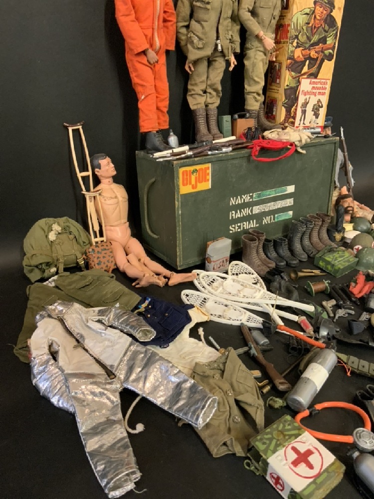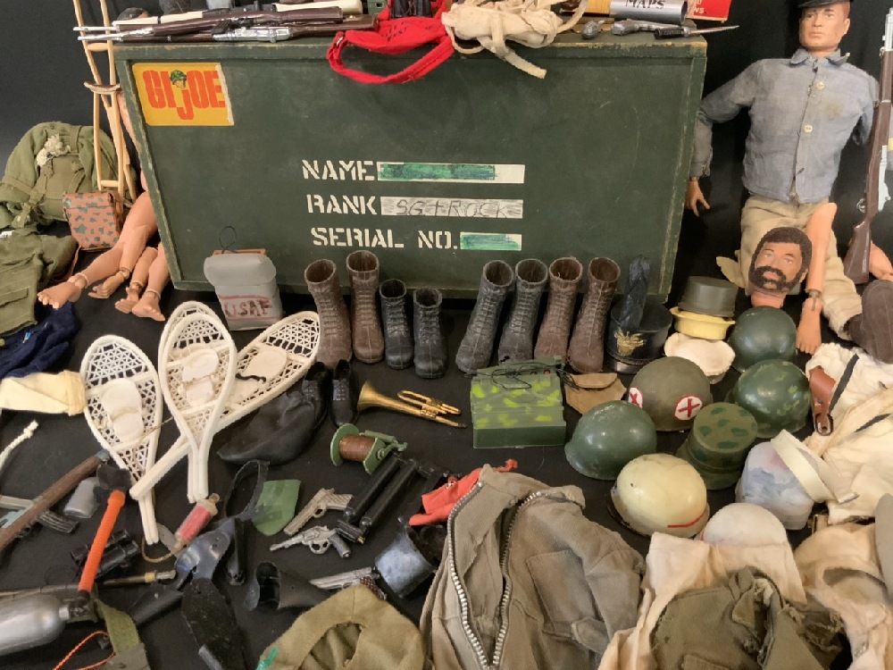 1960s GI Joe Lot W/ Clothing, Accessories & (1) Box - Over 115 Items. One Doll Has Original Box. Locker, Large Amounts of Accessories etc. Four More Figures, Detached Limbs on Two which are present.