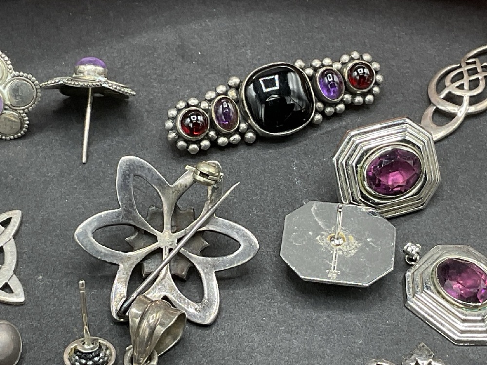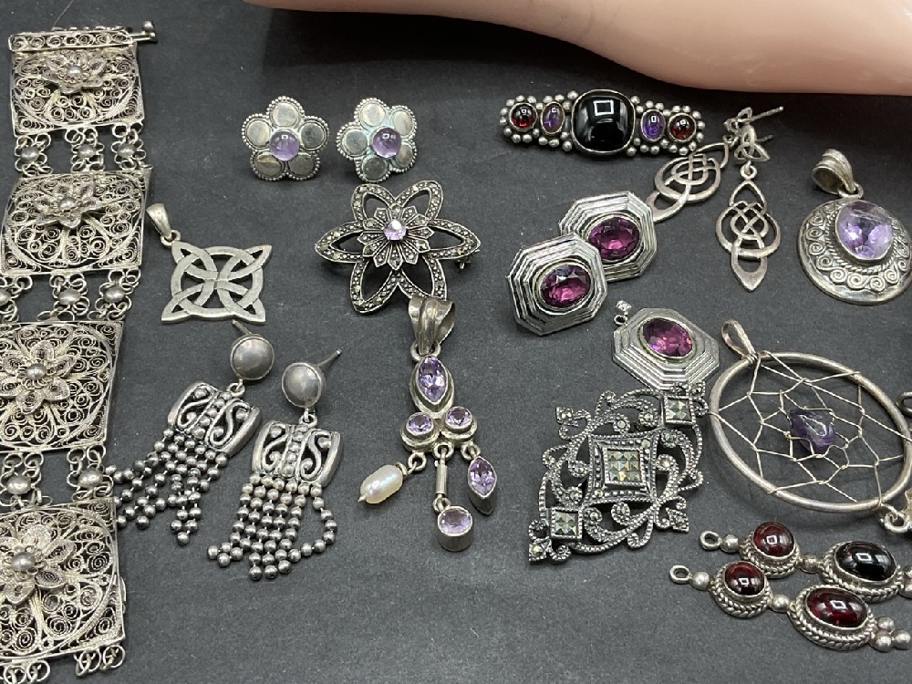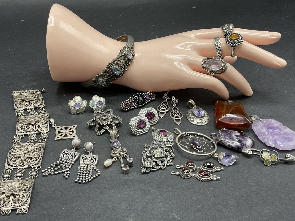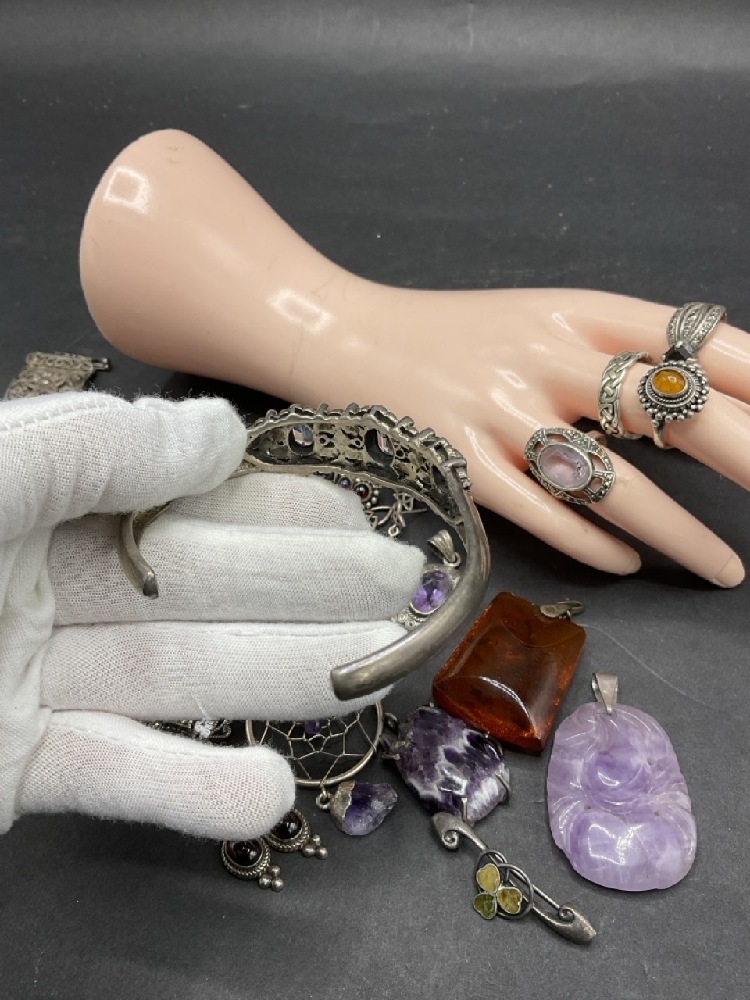 Compiled Sterling Silver Jewelry group with Amethyst and Amber Stones.