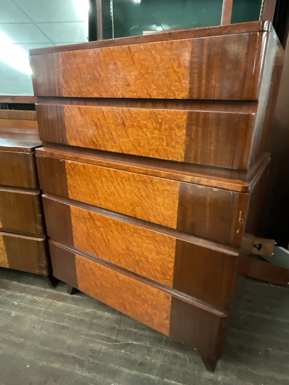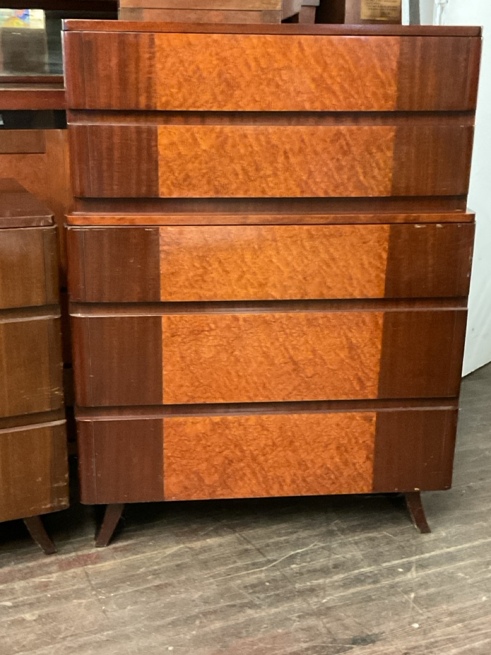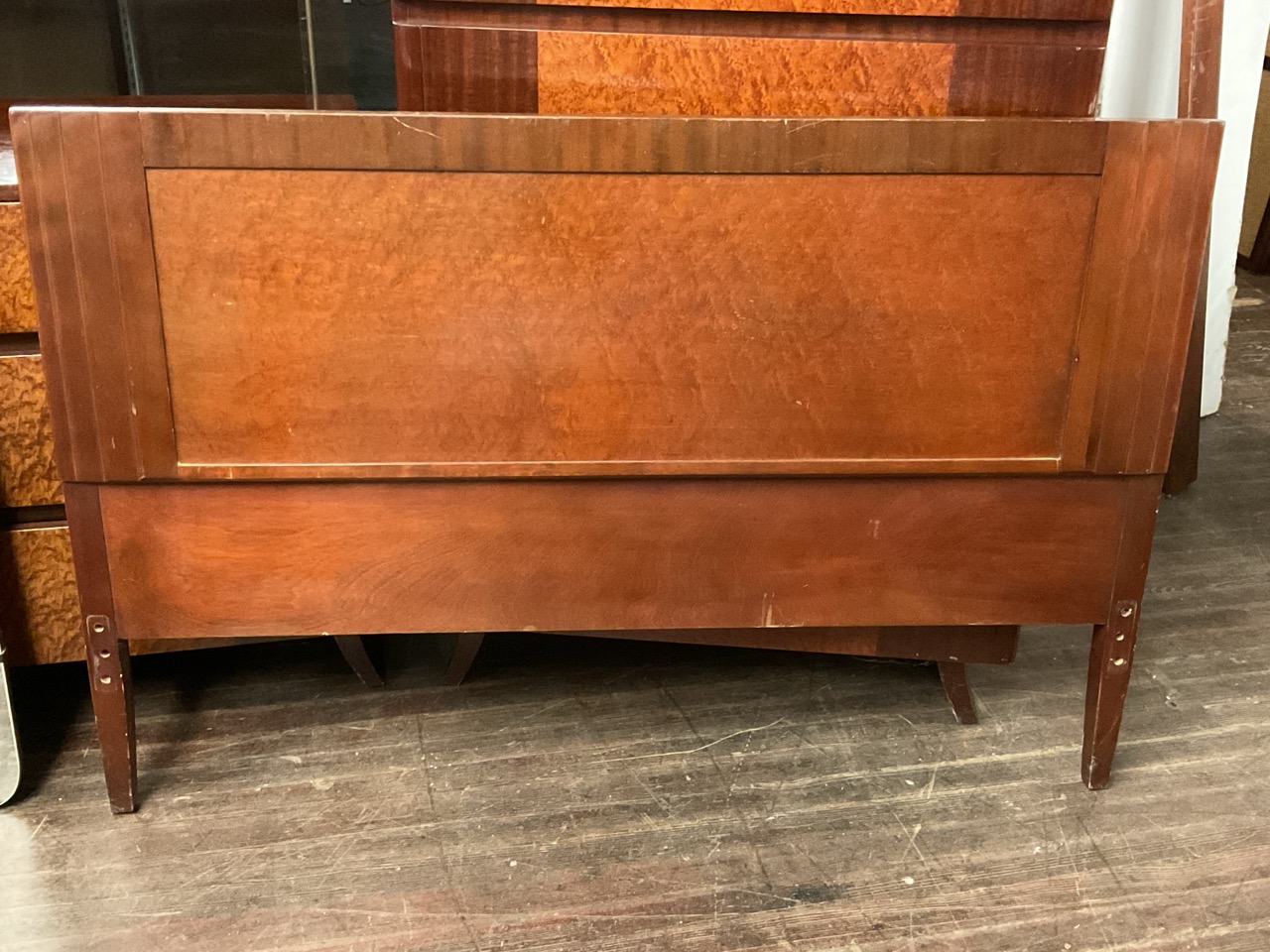 RWAY Mid Century Modern Bedroom Suite. Solid mahogany set with birdseye maple veneer. Dresser with mirror, bureau (chest), vanity with mirror and stool, full size headboard and footboard and night stand.
