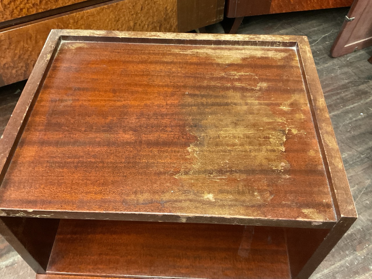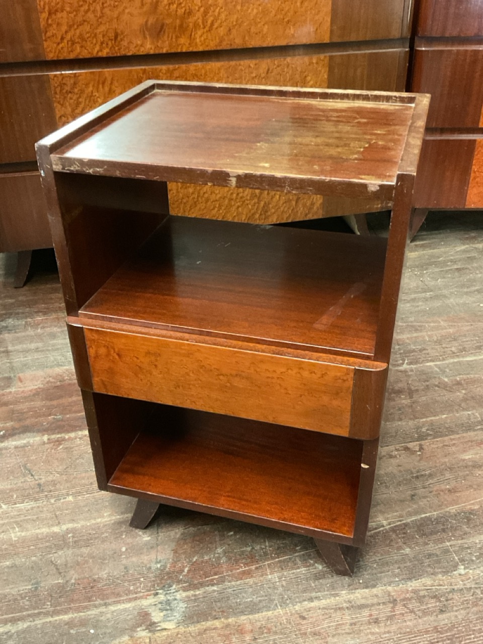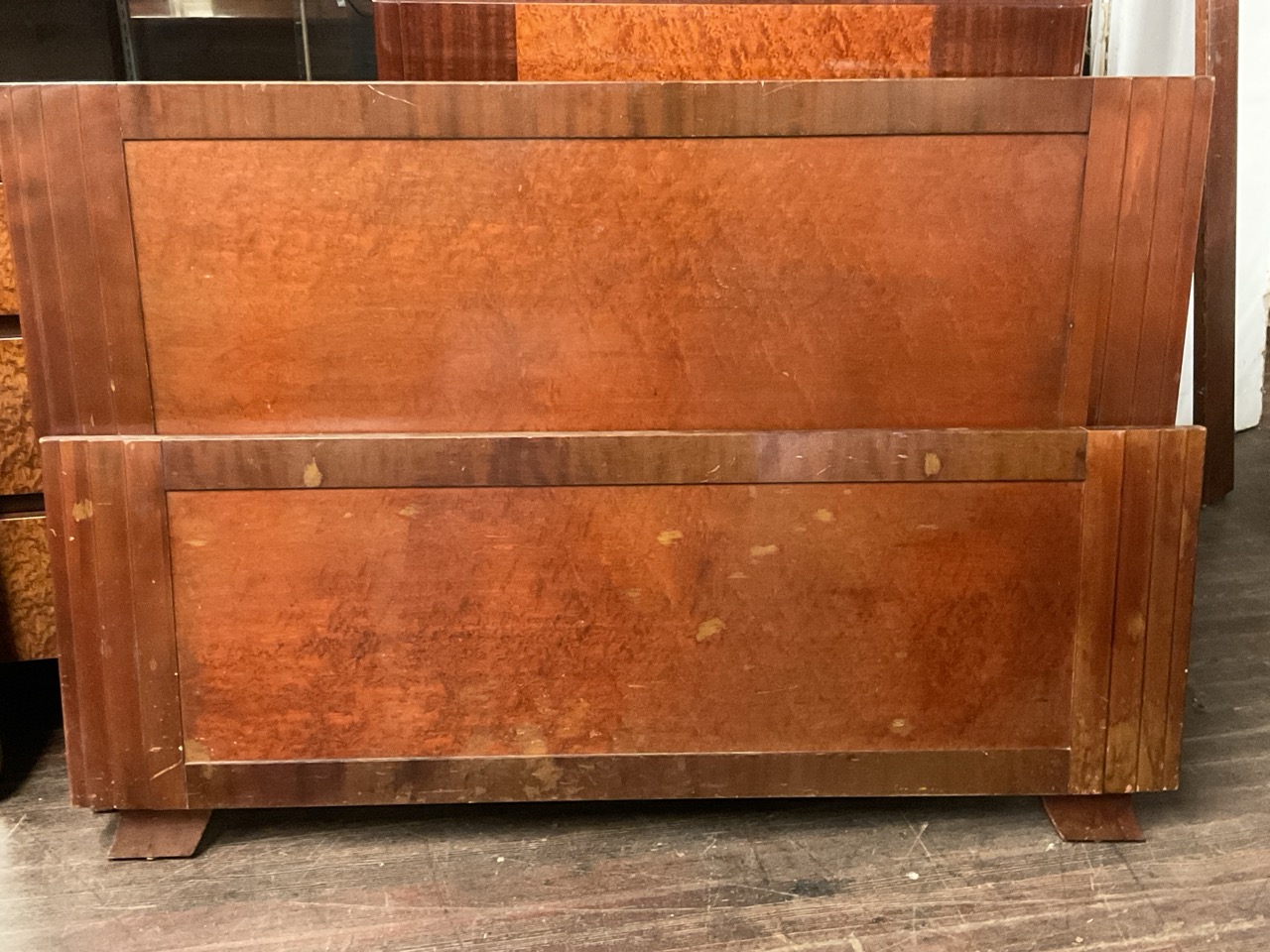 RWAY Mid Century Modern Bedroom Suite. Solid mahogany set with birdseye maple veneer. Dresser with mirror, bureau (chest), vanity with mirror and stool, full size headboard and footboard and night stand.