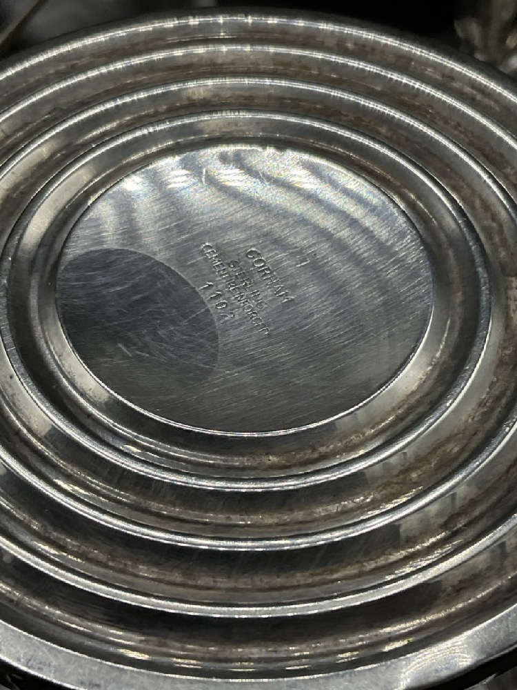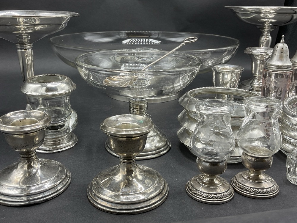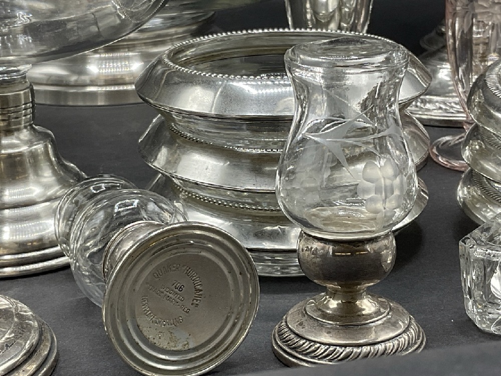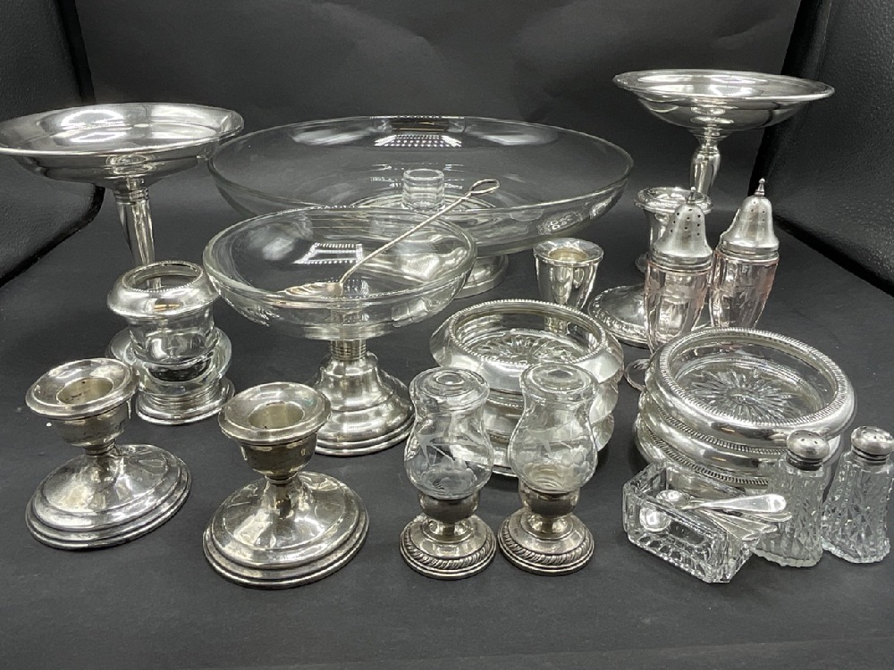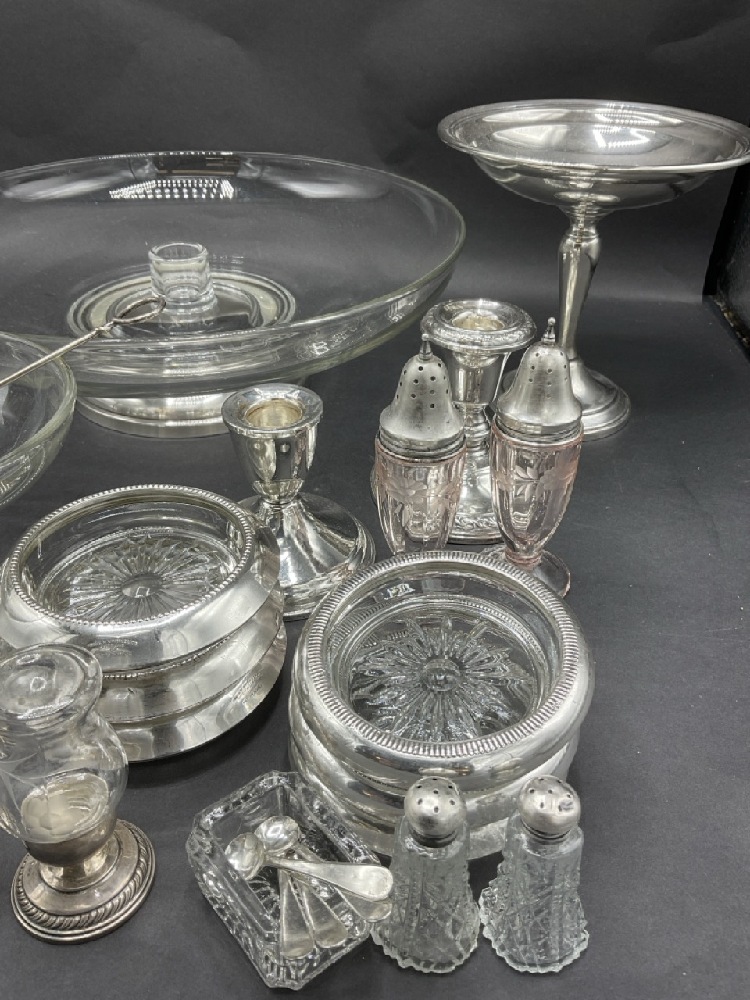 Four (4) sterling silver salt spoons, Salt and pepper shakers, hurricane lamps, compotes, serving dish, spoon, candlesticks and coasters.