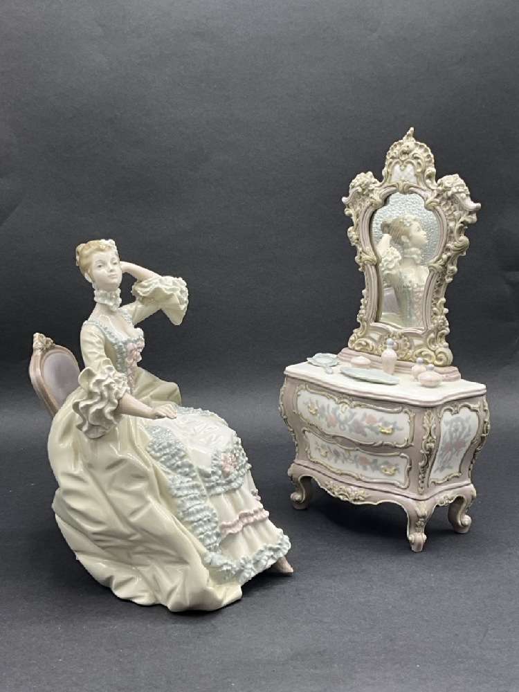 Lladro 2 pcs Lady #1242 with Dressing Table. Dimensions: Lady 10” H x 10” W x 5” Dressing Table 12 1/2 “ H x 7” W x 3” D Good Condition, Please See Preview Photographs