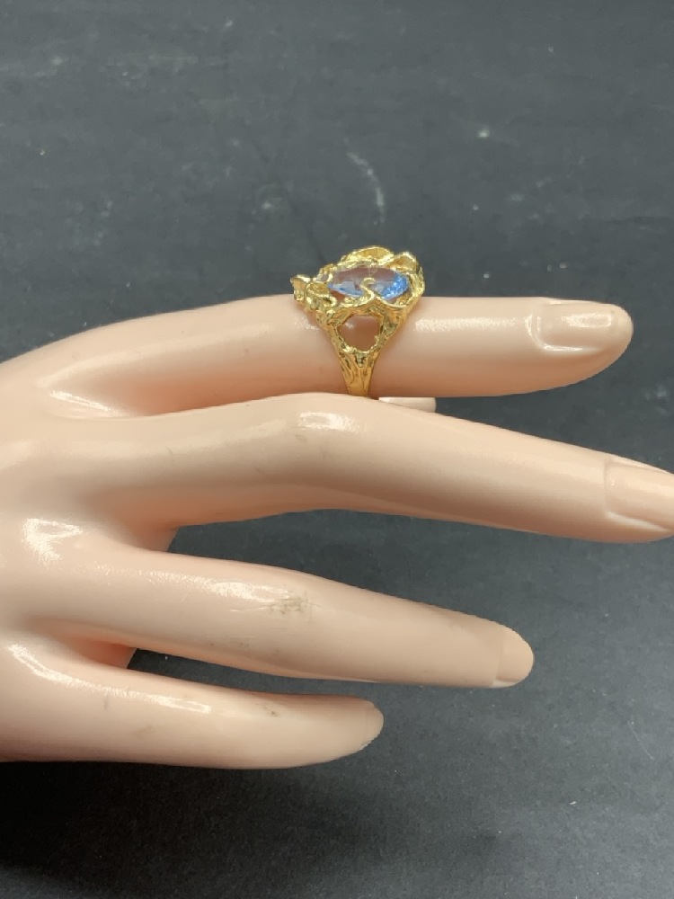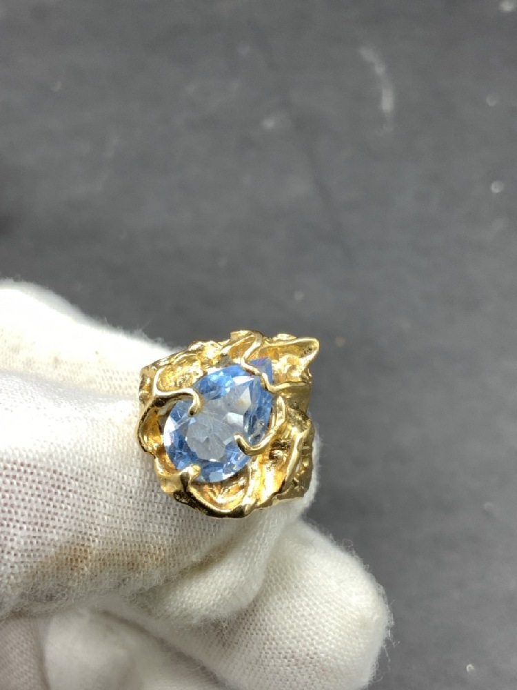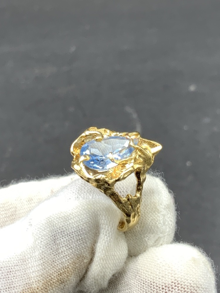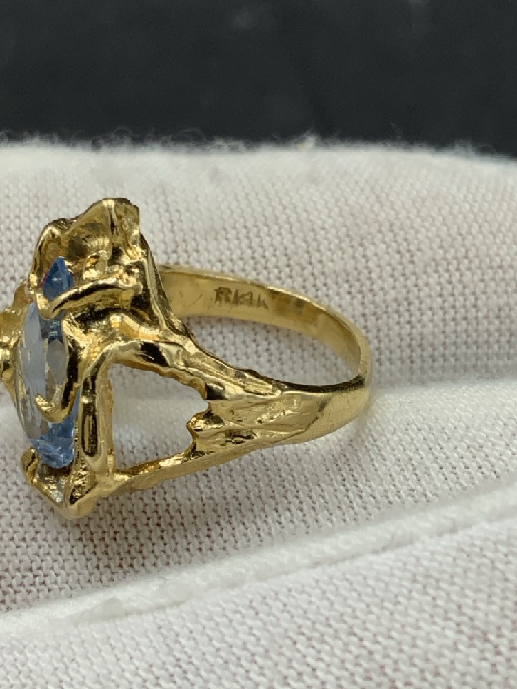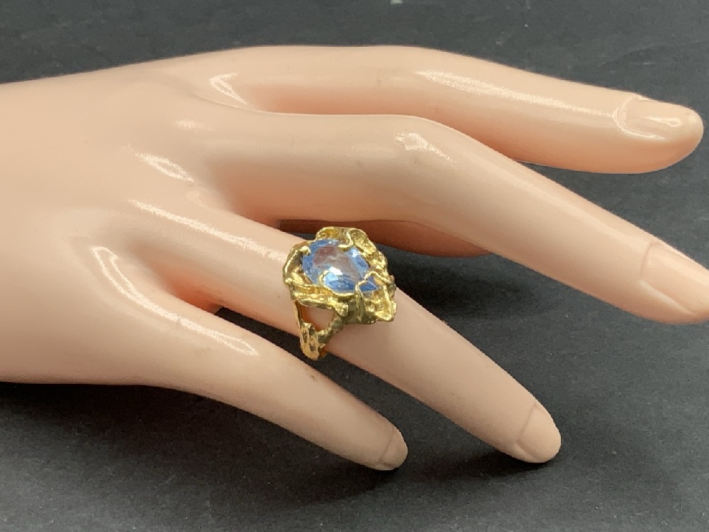 14K Yellow Gold Artisan Blue Topaz Ring Modernist Design.