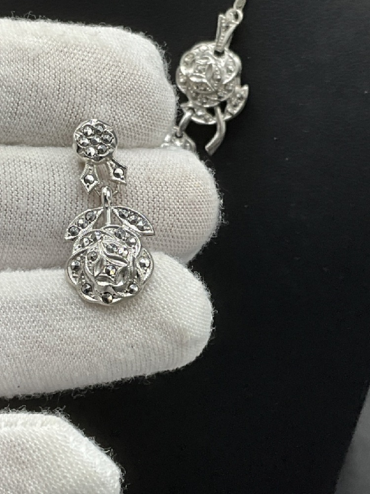 Vintage Sterling Silver Rose Marcasite Necklace, Bracelet and Earrings.