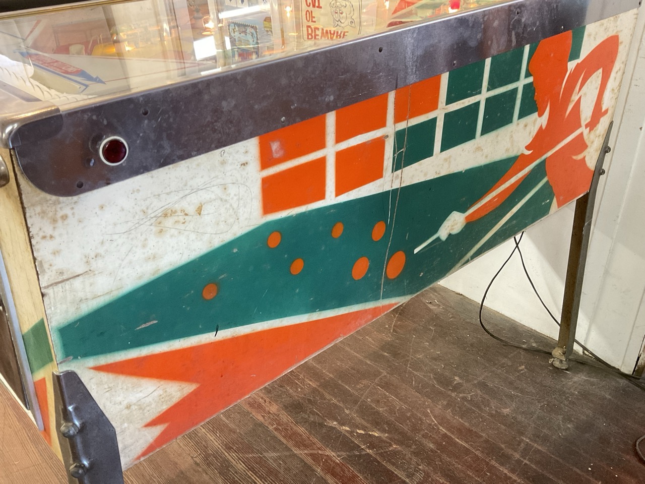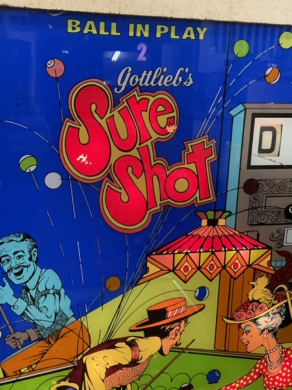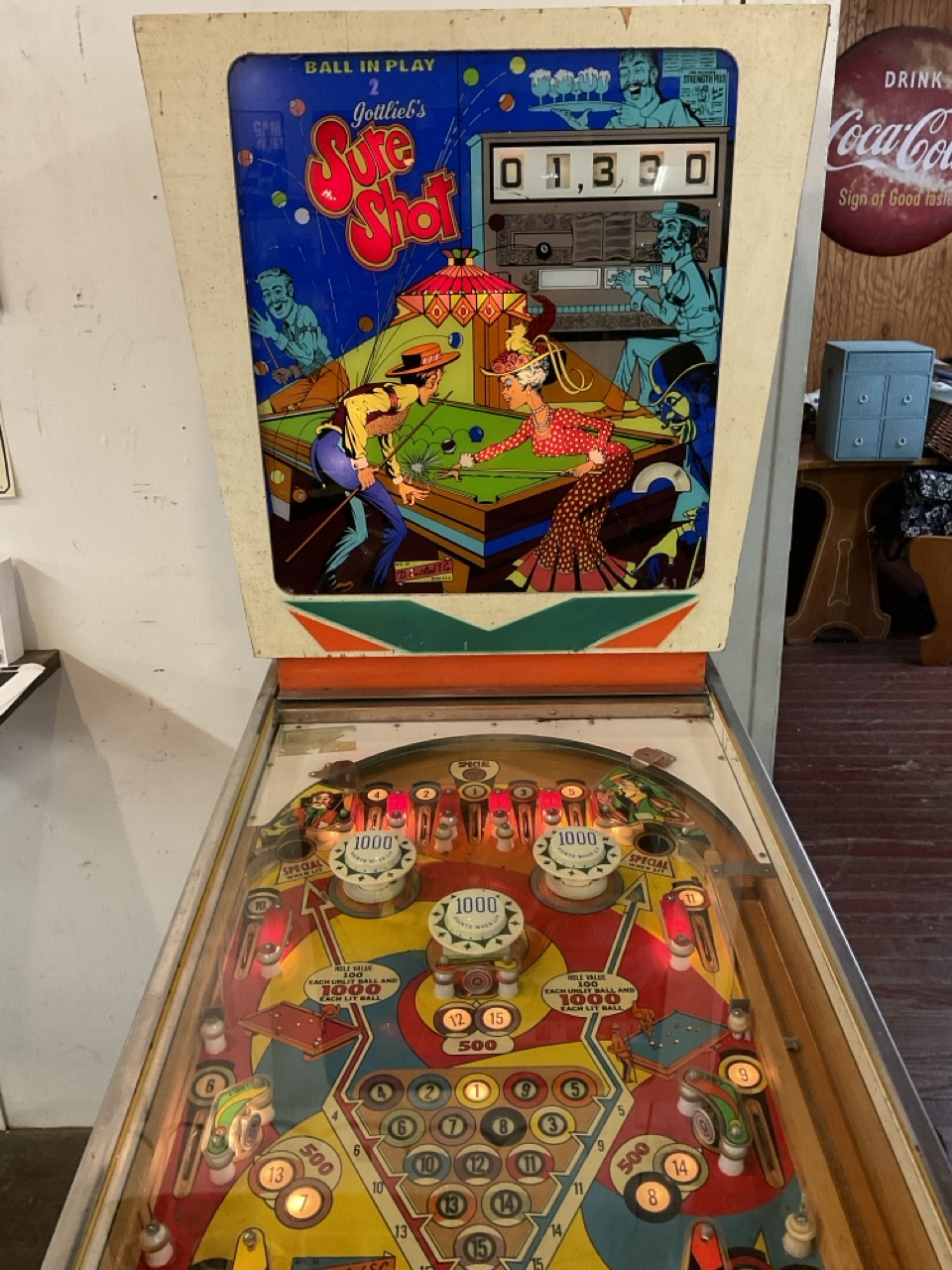 Vintage 1970's Gottlieb’s Sure Shot Pinball Machine. Working order however a full look over needed. Pinball machine has not been used in many years. We powered on and were able to play it fine.