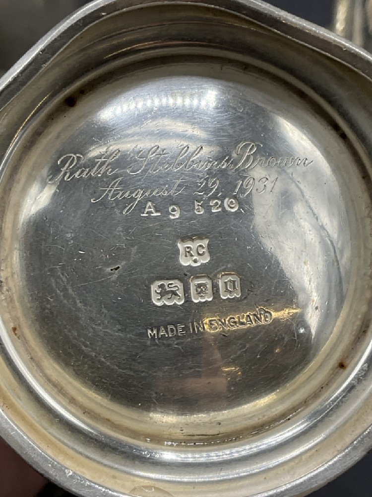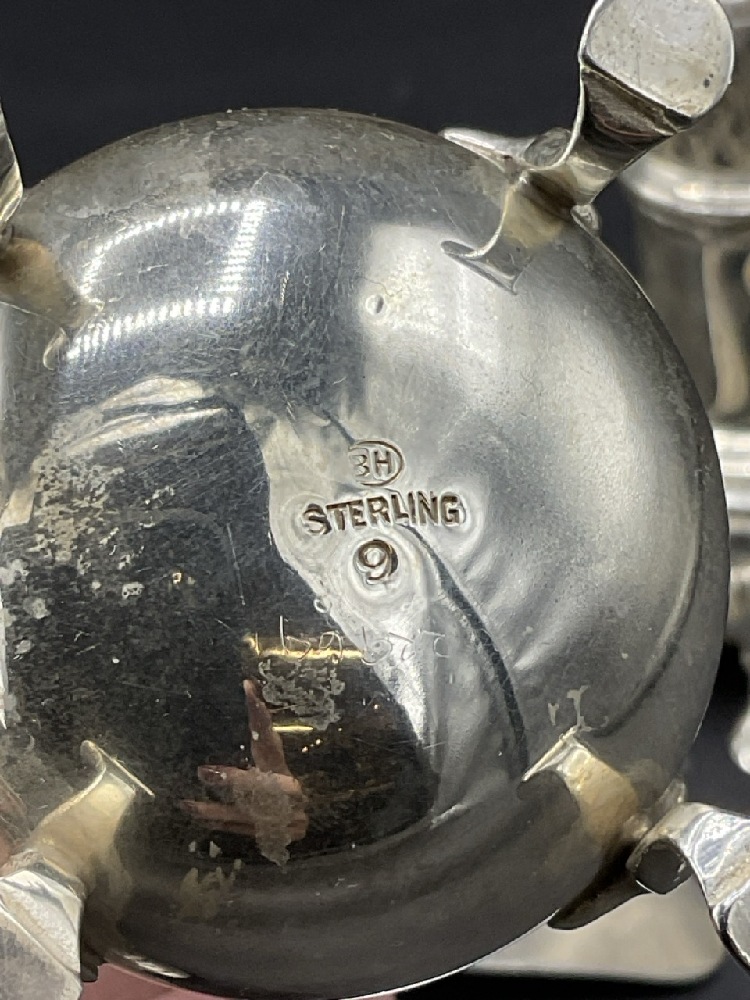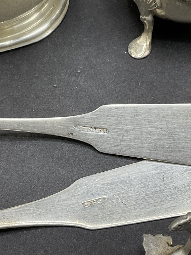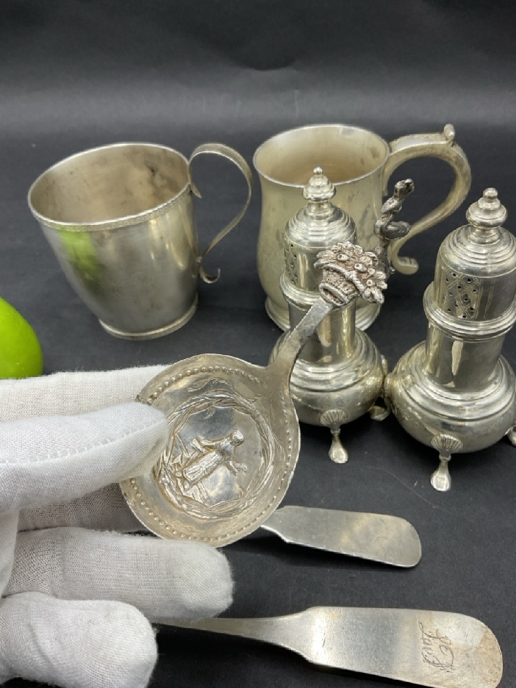Compiled Estate Sterling Silver Tablewares. A heavy English sterling silver cup, Georgian Tea Spoon, Cup, Coin Silver Spoons and Salt and Pepper Shaker.