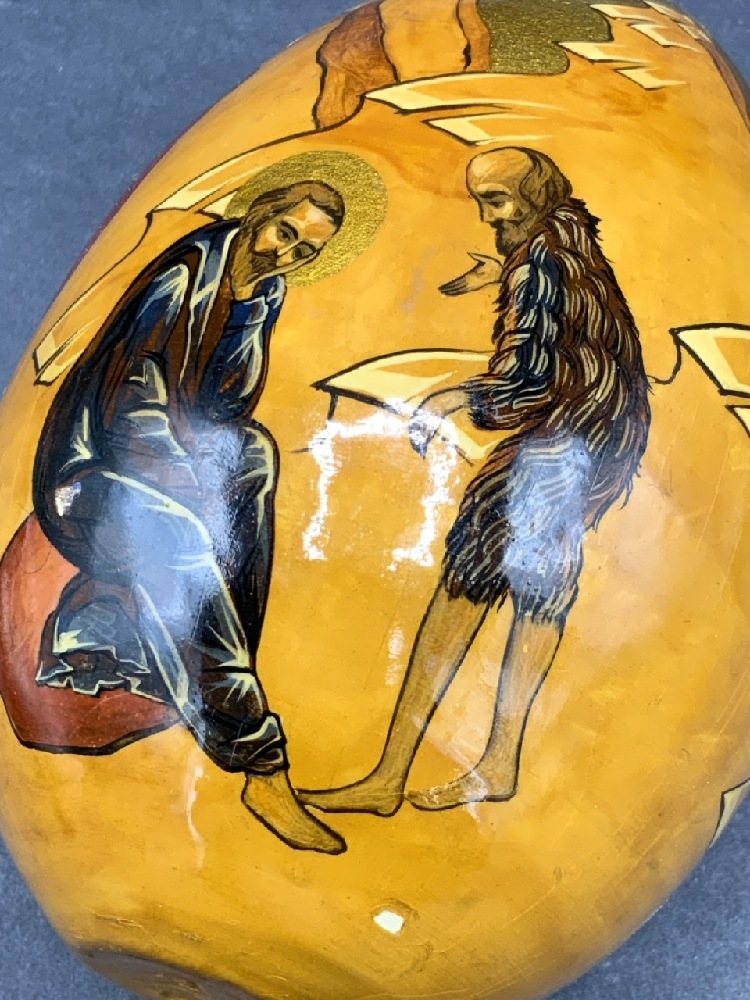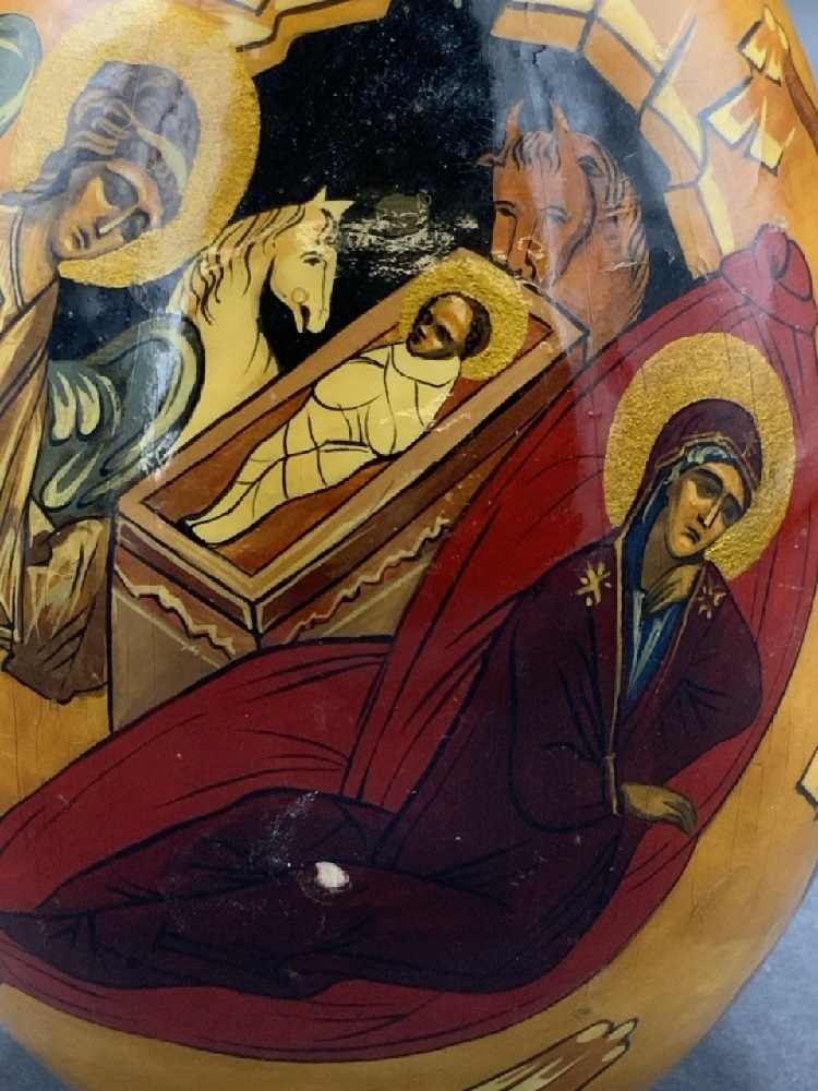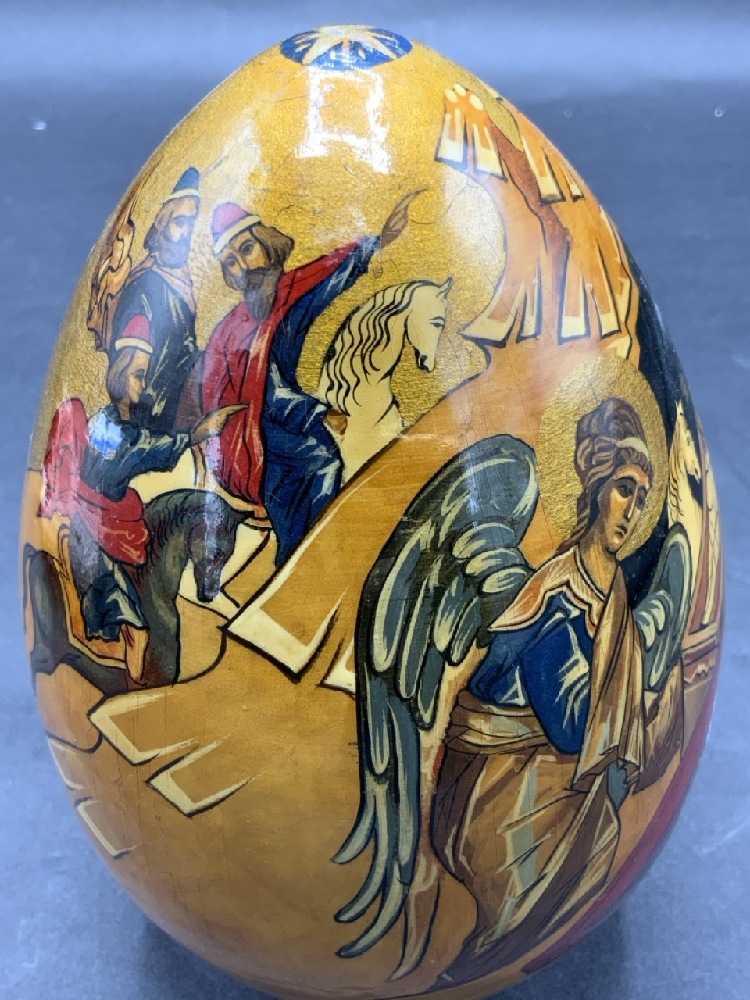 An antique Russian Orthodox Christmas Egg. Depicting the classical Orthodox scene of Jesus Christ in Manger with Angels, Mary and Three Kings. Joseph is facing away from scene speaking to the shepherd (satan) as he is filling him with doubt of the Immaculate Conception.