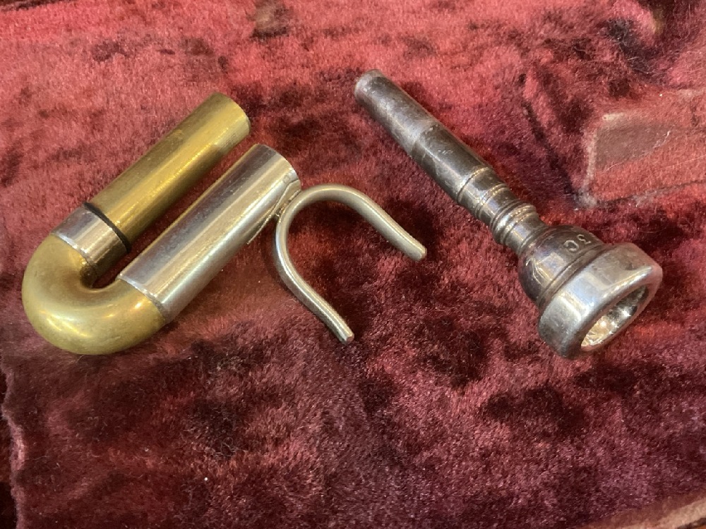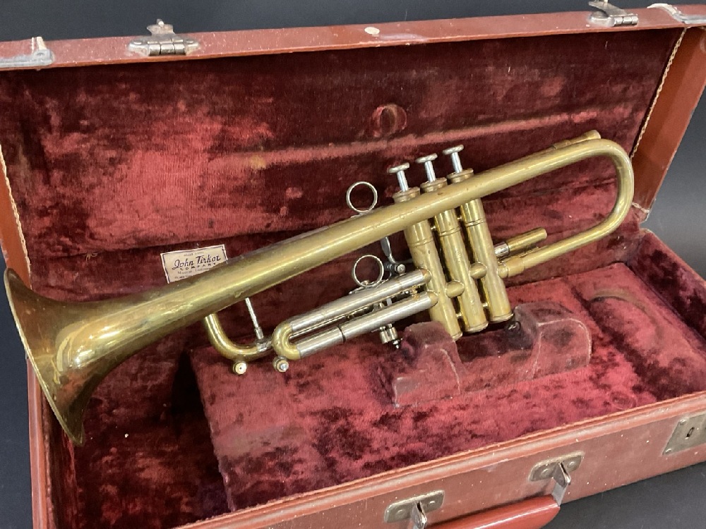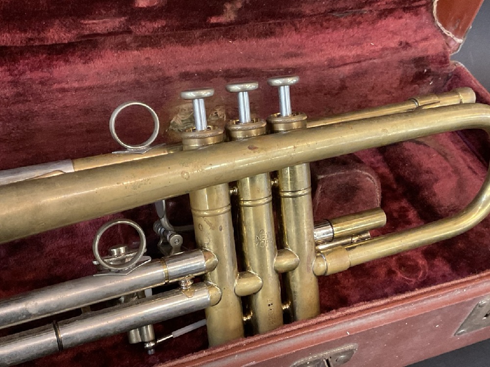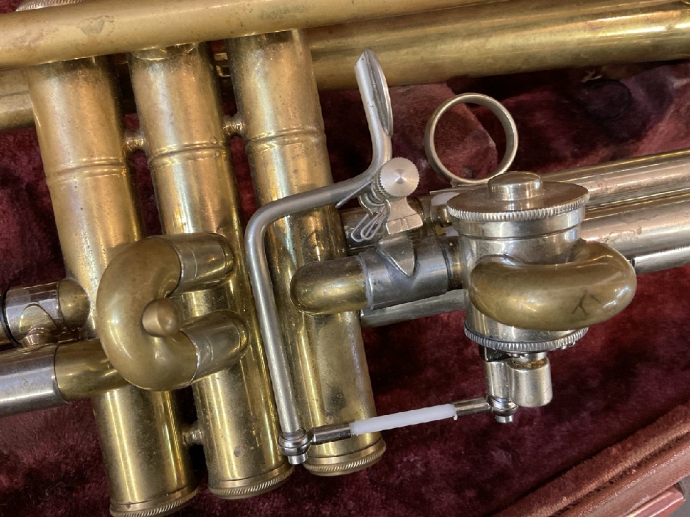 Four Valve Jaeger Quarter Tone Brass Trumpet. Working order. Housed in a hard case, not original to trumpet.