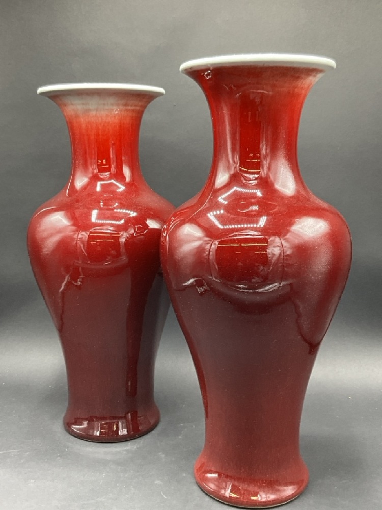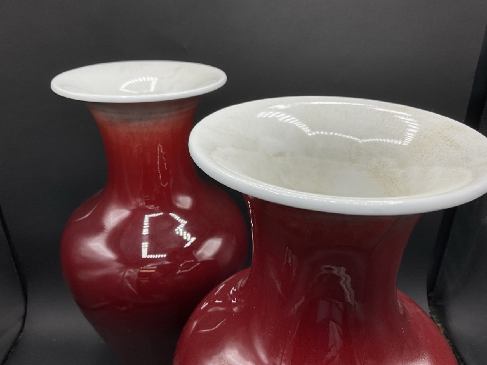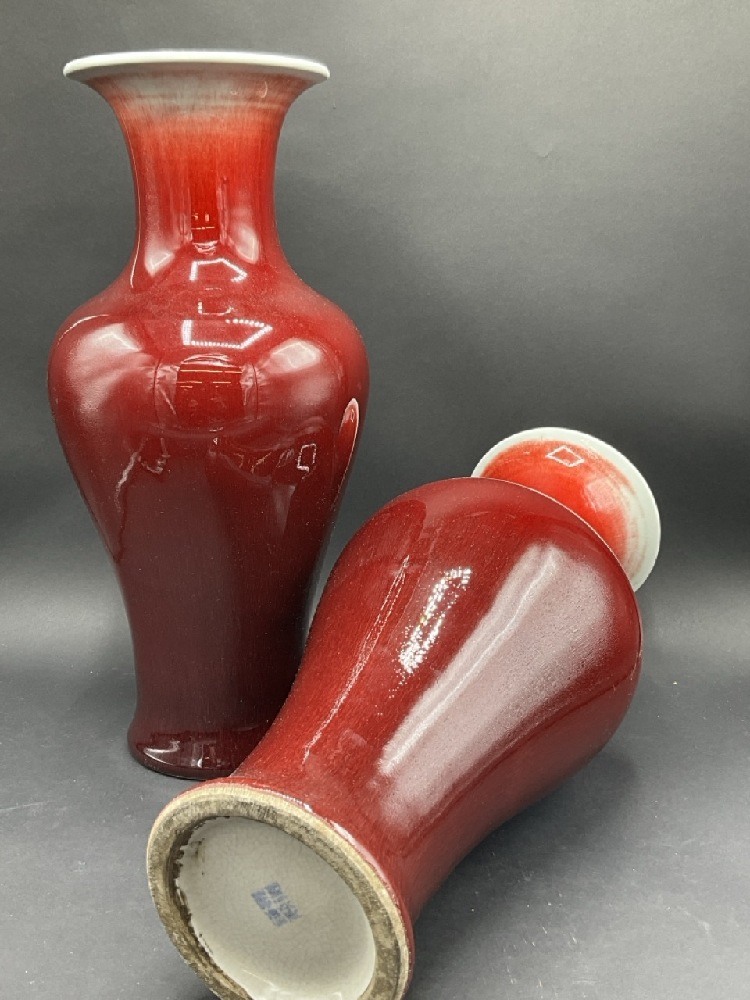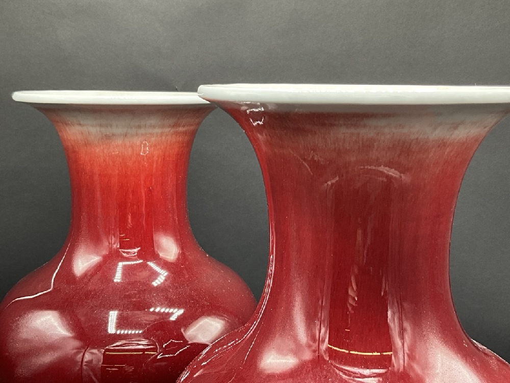 A Pair of Chinese Oxblood Vases. Signed at base. Some crazing noted in interior.