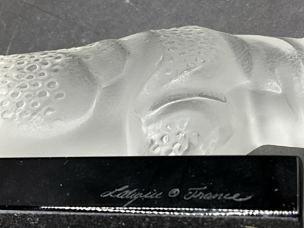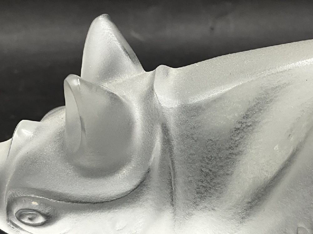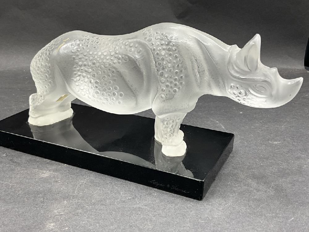 Lalique Rhinoceros Glass Sculpture. Signed Lalique, France. Small imperfection possibly at ear. Not fully determined. Dimensions: 5 3/4” x 12” x 4”