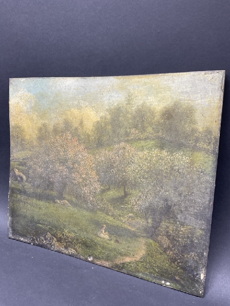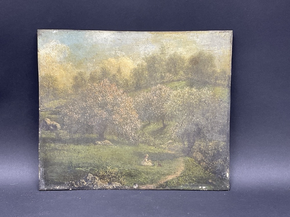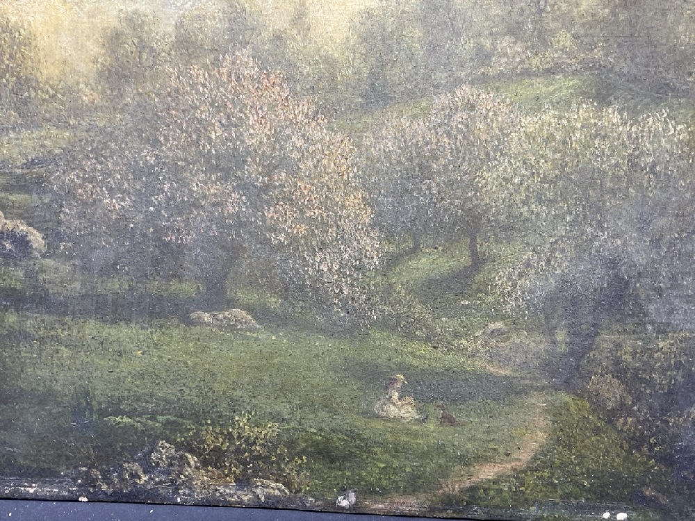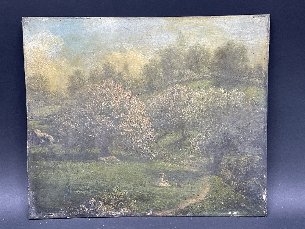 Oil on Board Painting of Scenic Landscape in an Orchard with a little girl and dog. Unsigned.