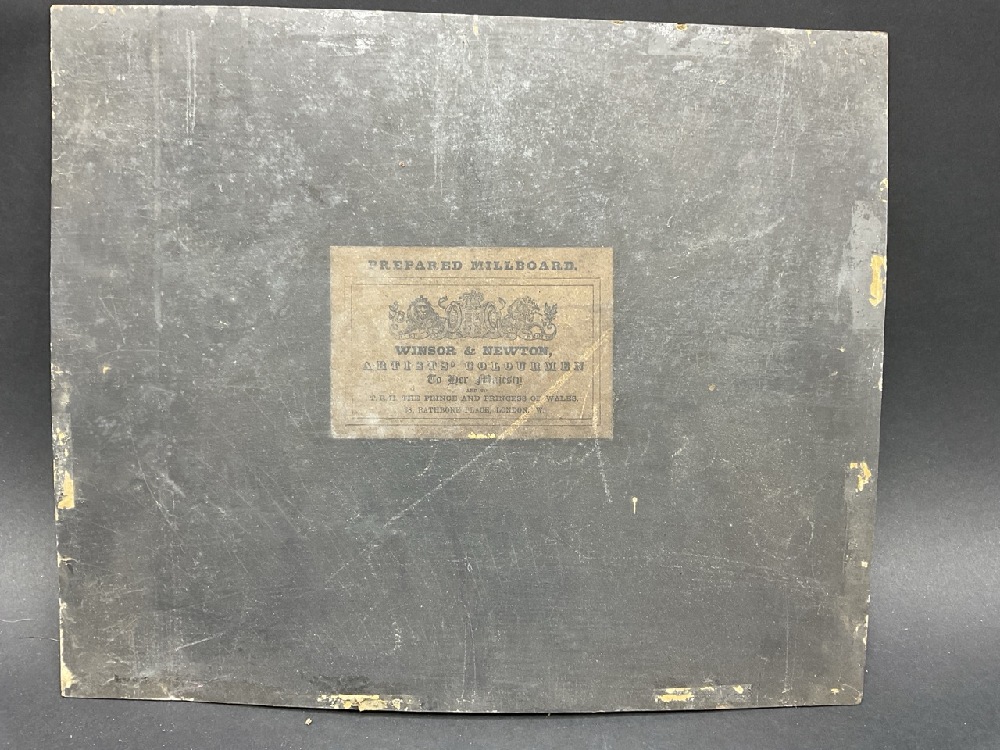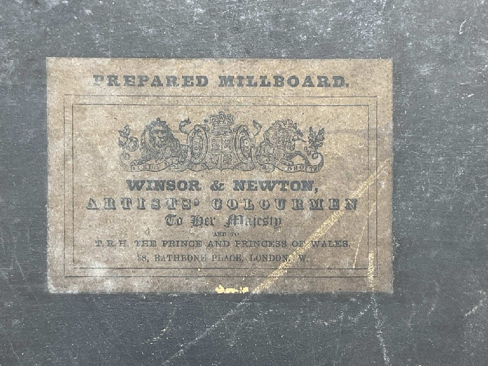 Back of painting reads: Prepared Millboard, Winsor & Newton Artists' Colourmen to her majesty and to TRH The Prince and Princess of Wales. 38 Rathborne Place London W.