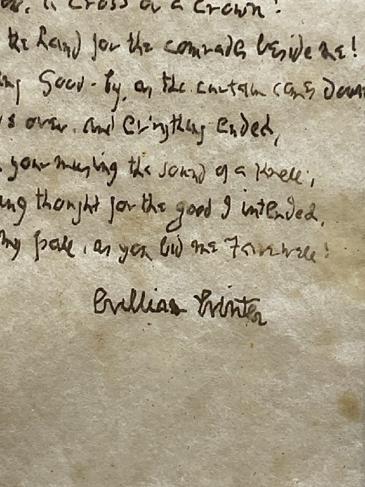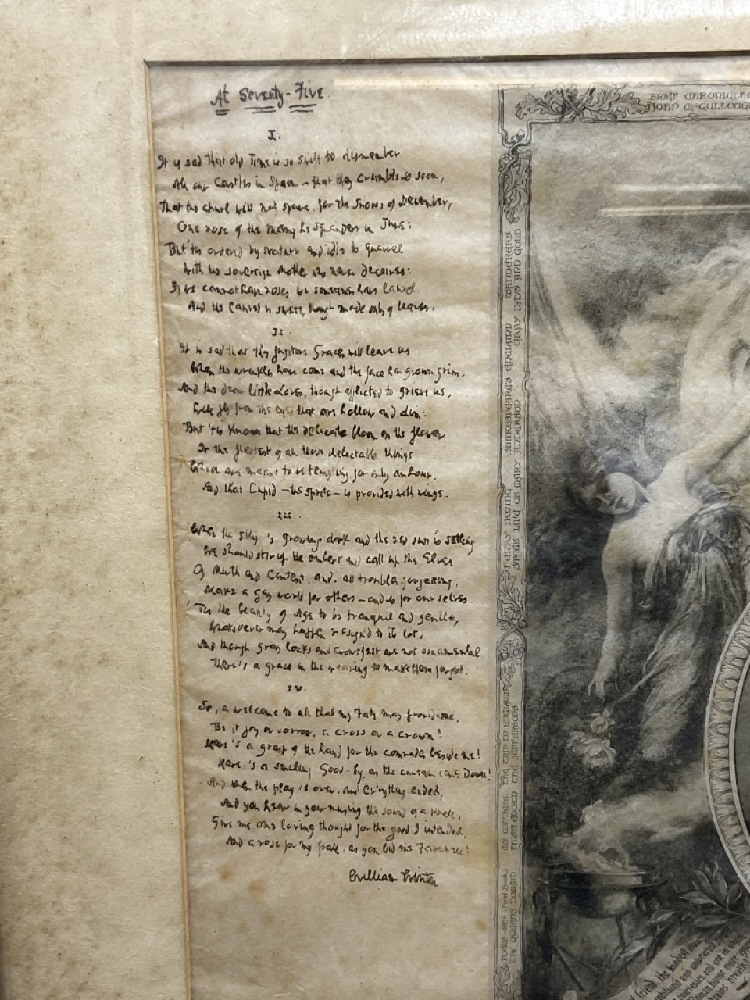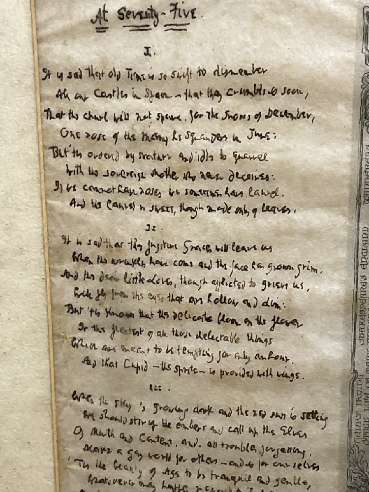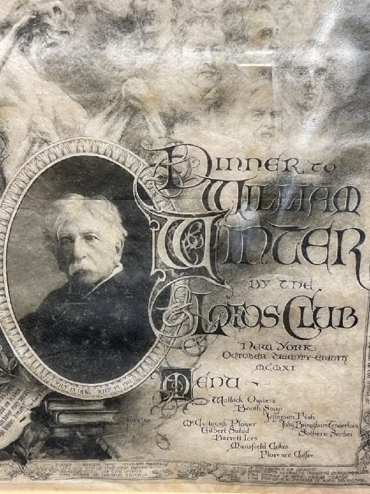 A special menu created for the even of William Winter's 75th Birthday. Famous Poet b. 1836. Poem is titled " At Seventy-Five"