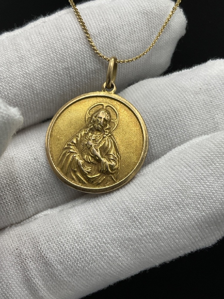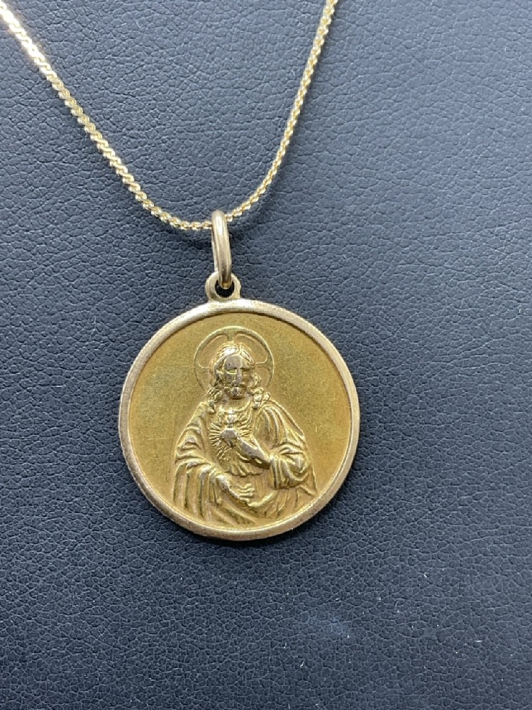18K Yellow Gold Vintage Jesus Christ Medal and Necklace. Reverse having Mother Mary with Child. Catholic Religious Piece.