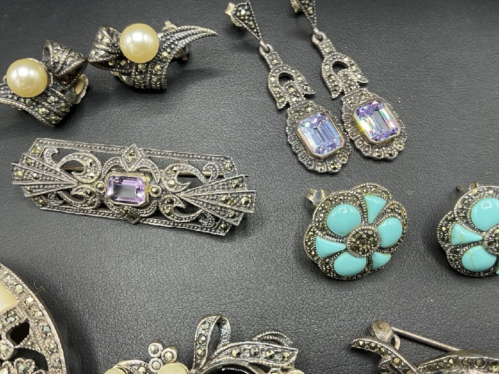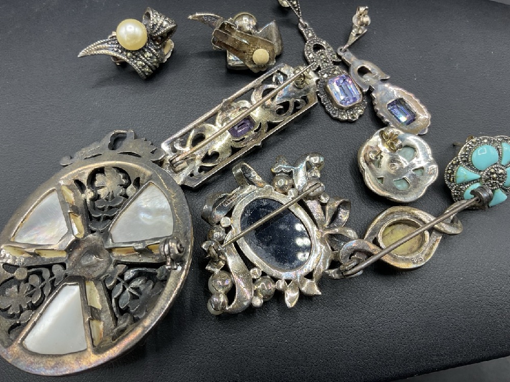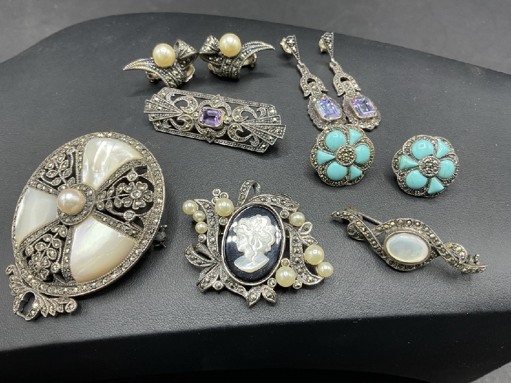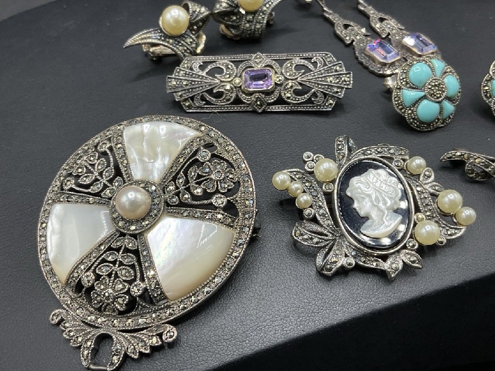 Sterling Silver Marcasite Jewelry Group. Fine Sterling Brooches, Cameo Brooch, Turquoise Earrings etc.