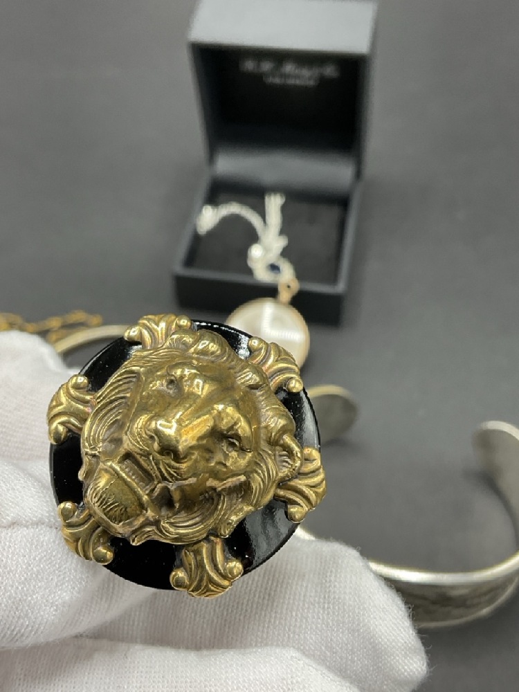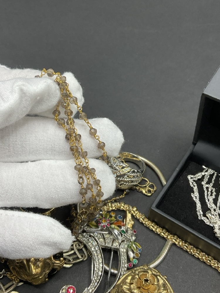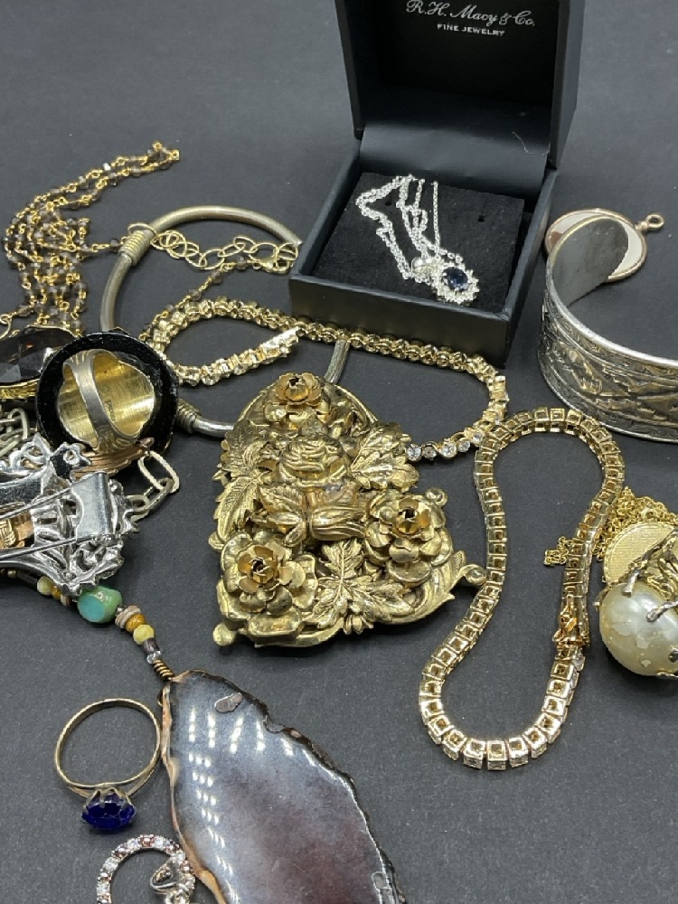 Compiled vintage costume jewelry group including a sterling silver diamond and sapphire necklace, majestic lion ring, early costume cornucopia clip etc. As seen in photograph preview.