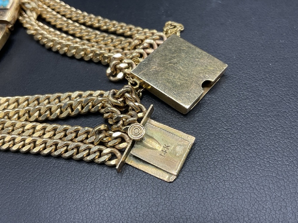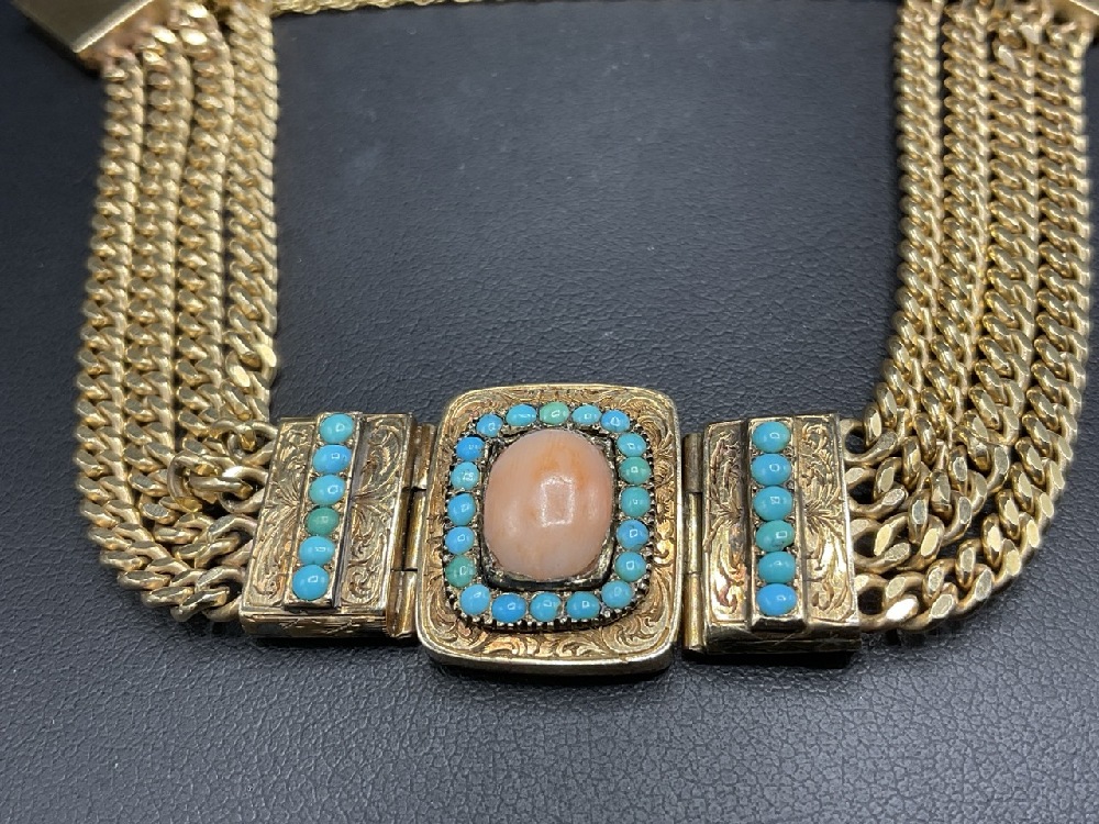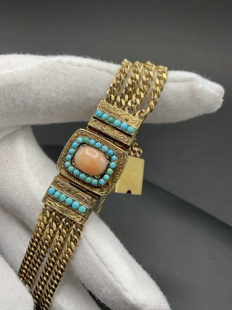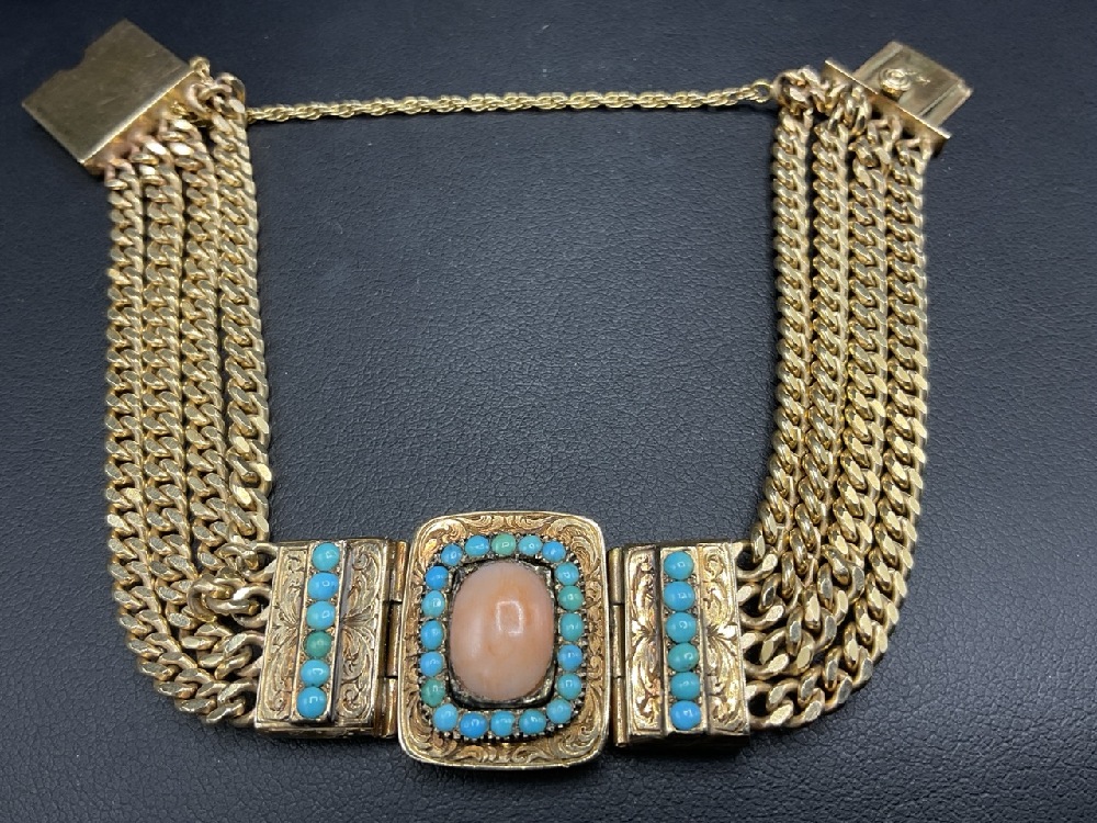 Antique 14K yellow gold Persian turquoise and coral bracelet.