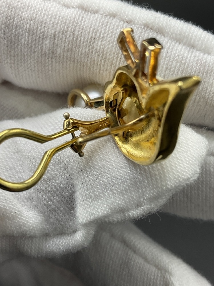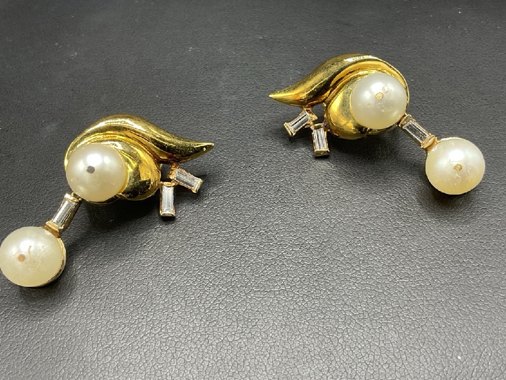 18K Pearl and Diamond Baguette Earrings.