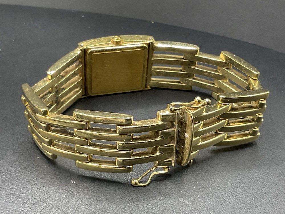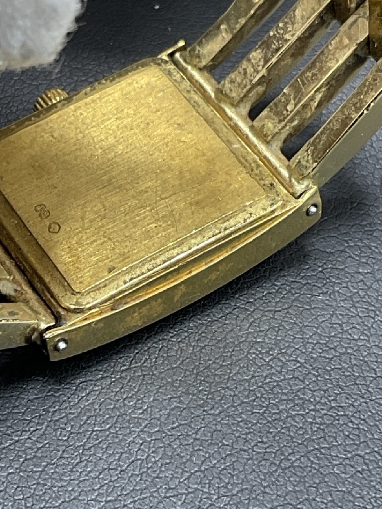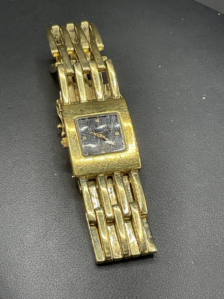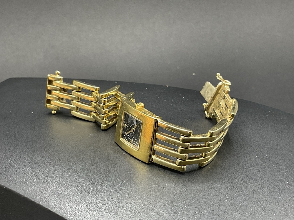 18K Tissot Lady’s Wristwatch. Watch is marked for 18K and band is 14K gold. Excessive scratching to front and crystal needs to be replaced.