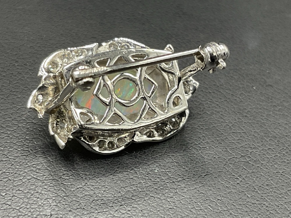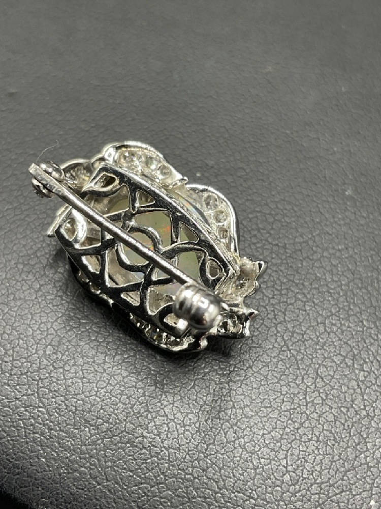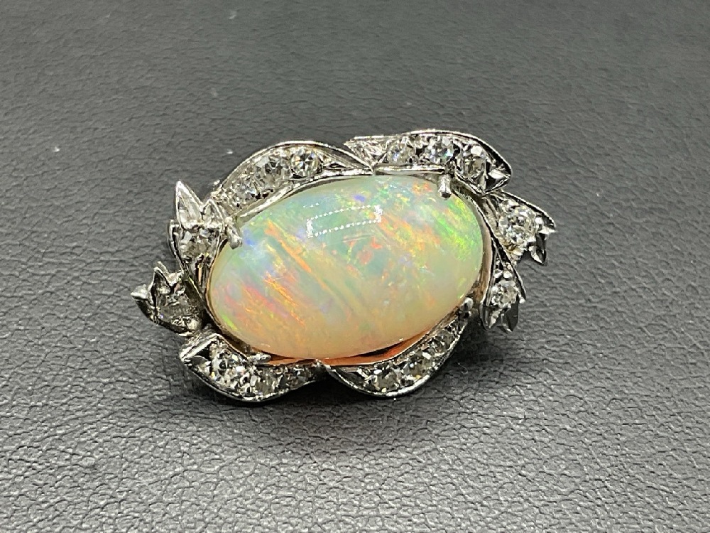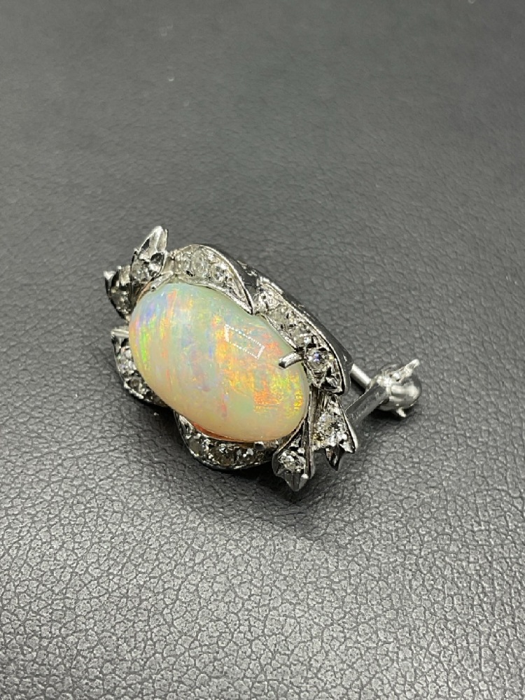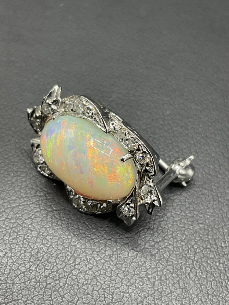 14K Fire Opal / Diamond Clasp Converted to Pin. Large fire opal stone surrounded by brilliant diamonds. Originally used as necklace clasp, family heirloom converted to pin.