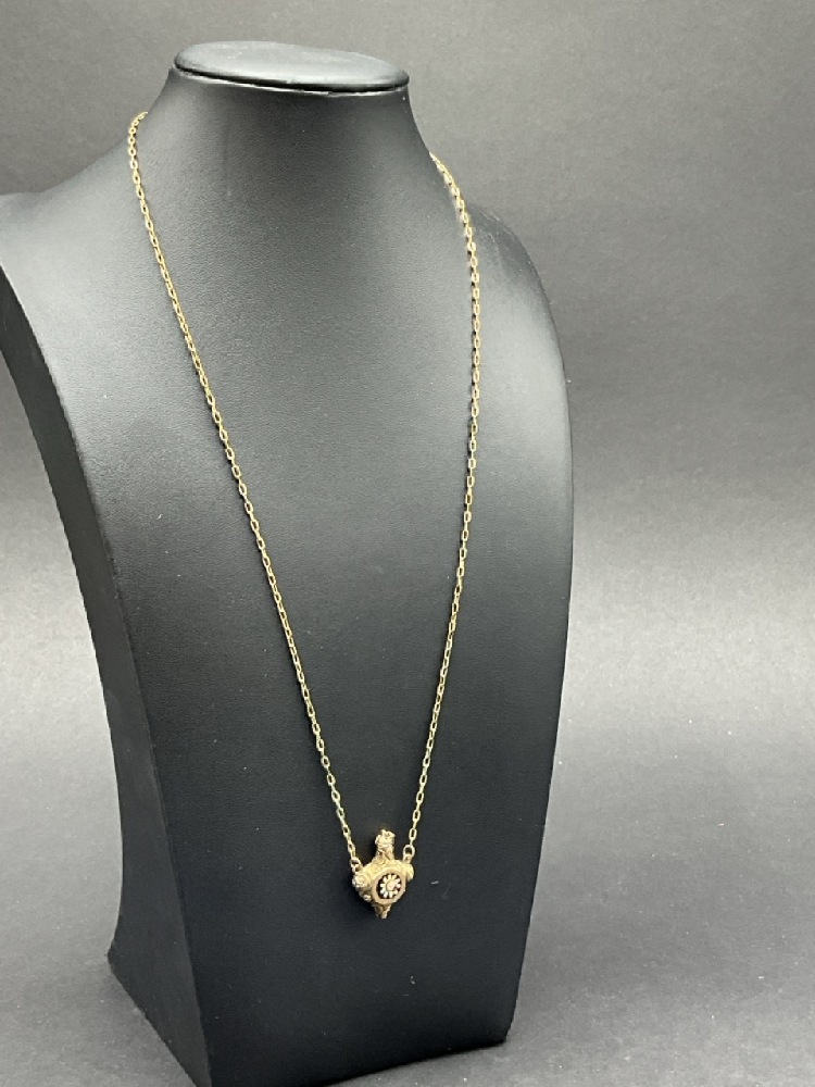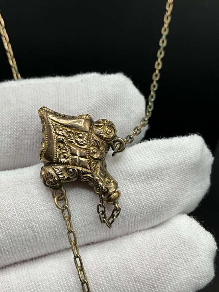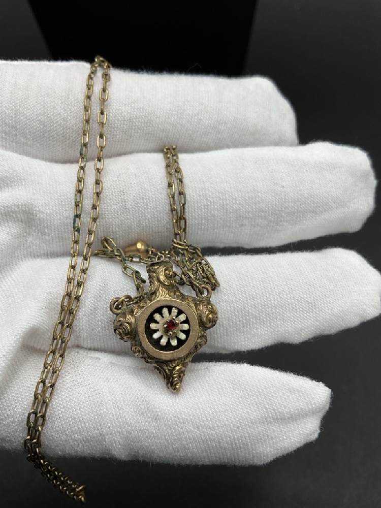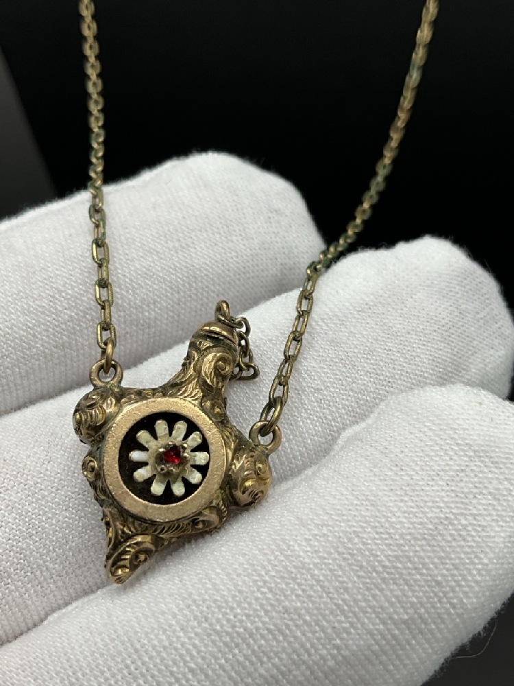 Antique 14K Apothecary Scent Bottle Charm Pendant with Ruby Stone and Necklace.